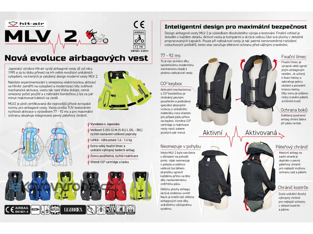 Nejenom další moto airbagAirbagová vesta MLV 2 je dovedena k dokonalosti mnoha lety vývoje a vylepšení. Její design je navrhnutý tak aby poskytovala tu nejlepší ochranu přesně tam kde je potřeba, proto má extra zvětšený límec pro fixaci helmy při pádu, zvětšené boční airbagy, velký zádový airbag vyztužený pevným chráničem páteře a zcela unikátní vyklápěcí airbag pro ochranu beder, kostrče a pánve.Vylepšená bezpečnost ovšem není za cenu pohodlí, právě naopak, vesta MLV 2 je navržená aby nijak neomezovala v pohybu, je lehká, pohodlná a díky nastavení velikosti sedne přímo na tělo.Vesty Hit-Air se vyrábí přímo v Japonsku z těch nejlepších materiálů a s typicky japonským důrazem na pečlivost a kontrolu kvality.K vestě MLV 2 si můžete přikoupit hrudní a boční protektory, které ještě více zvýší úroveň Vaší ochrany v okamžiku pádu nebo kontaktu s částmi motocyklu jako jsou řidítka, nádrž, atd. Moderní materiály a nízká hmotnost