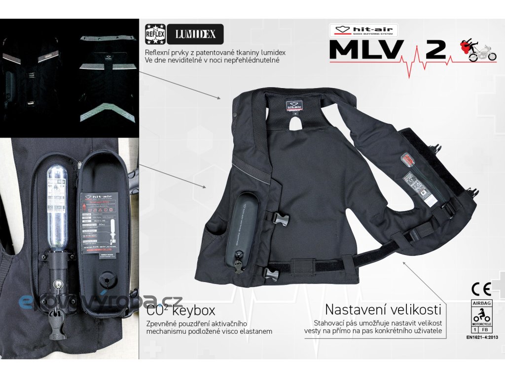 Nejenom další moto airbagAirbagová vesta MLV 2 je dovedena k dokonalosti mnoha lety vývoje a vylepšení. Její design je navrhnutý tak aby poskytovala tu nejlepší ochranu přesně tam kde je potřeba, proto má extra zvětšený límec pro fixaci helmy při pádu, zvětšené boční airbagy, velký zádový airbag vyztužený pevným chráničem páteře a zcela unikátní vyklápěcí airbag pro ochranu beder, kostrče a pánve.Vylepšená bezpečnost ovšem není za cenu pohodlí, právě naopak, vesta MLV 2 je navržená aby nijak neomezovala v pohybu, je lehká, pohodlná a díky nastavení velikosti sedne přímo na tělo.Vesty Hit-Air se vyrábí přímo v Japonsku z těch nejlepších materiálů a s typicky japonským důrazem na pečlivost a kontrolu kvality.K vestě MLV 2 si můžete přikoupit hrudní a boční protektory, které ještě více zvýší úroveň Vaší ochrany v okamžiku pádu nebo kontaktu s částmi motocyklu jako jsou řidítka, nádrž, atd. Moderní materiály a nízká hmotnost
