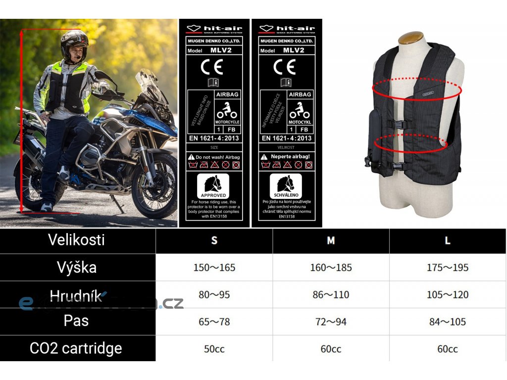 Všechny vesty jsou ve velikostech M a L a některé navíc i ve zmenšené velikosti S. Velikost S je opravdu maličkatá a hodí se zejména pro děti a dorost a opravdu drobné slečny. Velikost M odpovídá konfekčnímu rozpětí S – XL a velikost L odpovídá rozpětí XL – 3XL a lze ji ještě zvětšit použitím rozšiřovacích pásků. Nastavitelný pásek a důmyslný střih tak znamená, že nejenom, že každá velikost má opravdu velké rozpětí, ale také že se nemusíte bát, že vám vesta už nebude když naberete nebo shodíte nějaké to kilo.7. A co certifikace a možnosti využití? Vesty MLV2 mají certifikát EN 1621-4:2013 jako airbagová vesta pro použití na jízdu na motocyklu a hodí se na jízdu na všech pozemních komunikacích i v terénu. Kromě toho jsou výrobcem určeny i pro jízdu na koni kde se doporučuje jejich použití zároveň s chráničem těla podle normy EN 13158. Pokud tedy kromě těch koní na dvou kolech sedláte i nějaké ty živé můžete pro vestu najít dvojí uplatnění, jen si nezapomeňte dokoupit lanko pro připevnění k jezdeckému sedlu, které se od toho na motocykly odlišuje.