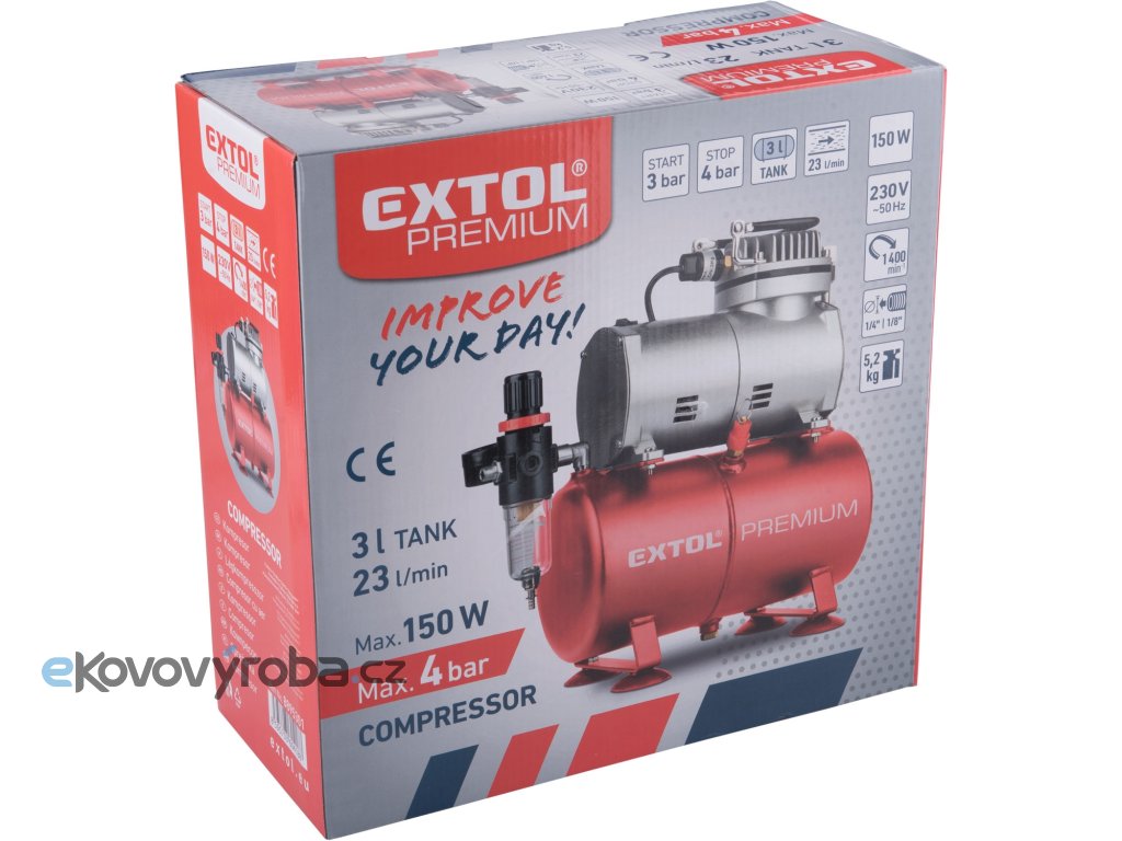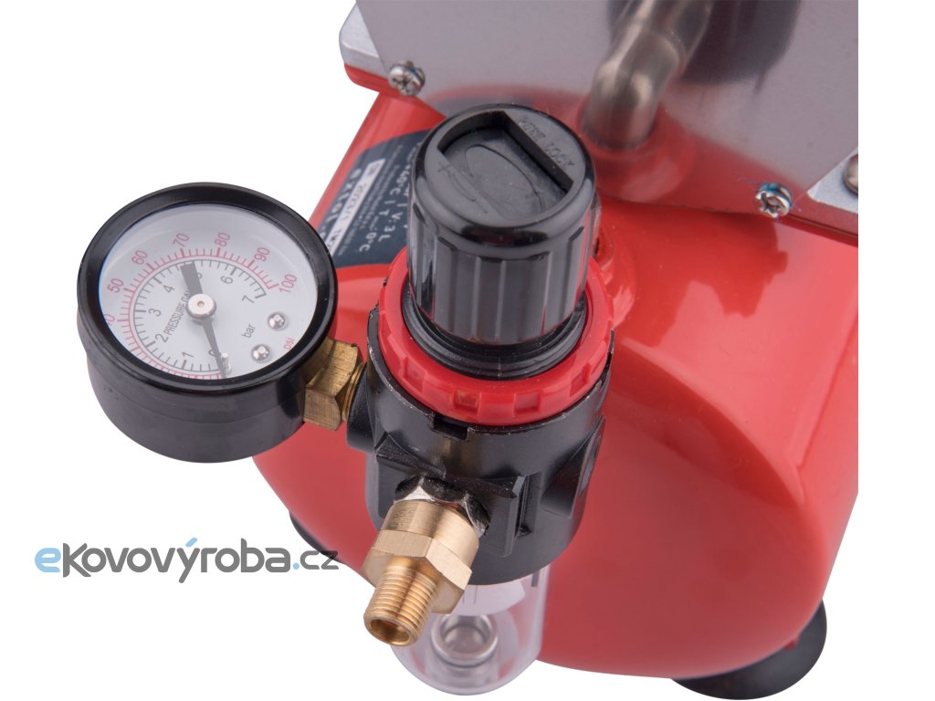 Tichý pístový kompresor je určen především pro stříkací pistole (airbrush) a další vzduchové nářadí jako například sponkovačky, ofukovací pistole, atd. Je vhodný i pro huštění pneumatik bicyklů i automobilů. Kompresor má 3l vzduchovou nádrž, která zajišťuje plynulý proud vzduchu pro práci. Je vybaven odlučovačem kondenzátu a nečistot ze vzduchu a tlakoměrem.