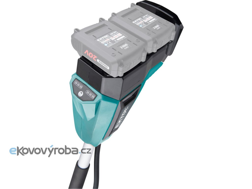 Silný aku křovinořez určený k sekání vysoké trávy nebo suché trávy, vysokých kopřiv a keřů a podrostu s průměrem kmene až 4cm s pomocí ocelového žacího nože nebo k sekání nižší trávy pomocí žací struny. Pro snadnou manipulaci při sekání má křovinořez ergonomicky tvarované rukojeti ve tvaru cyklořídítek a ramenní popruh, který přenáší většinu hmotnosti na tělo a ruce používáte jen pro jemnou manipulaci při sekání. Křovinořez je poháněn nejmodernějším „brushless” motorem. Tento nový typ motoru má vyšší životnost, je výkonnější a má menší spotřebu el. energie než klasické motory s uhlíkovými kartáči. Díky malé velikosti a při zachování vysokého výkonu je možné motor umístit do hlavy sekačky a díky tomu je v dlouhé tyči sekačky jen kabel, což umožňuje výrazně snížit vibrace a zvýšit efektivitu motoru. Do stroje se vkládají dvě baterie SHARE20V, které společně umožňují motoru mít vysoký výkon i při zatížení. Při použití žací struny ji lze při práci prodloužit poklepem na zem. Na rukojeti je snadno přístupné tlačítko pro zapnutí a regulaci otáček ve 3 stupních: 3800/5000/6700 otáček/min. Dále jsou tam umístněné bezpečnostní tlačítka zabraňující náhodnému spuštění stroje při manipulaci. Pro snadnou přepravu lze křovinořez jednoduše bez nástroje “rozpůlit” pomocí jednoho šroubu. Pro běžnou práci dostačují dva 2Ah akumulátory, oba dva můžete najednou rychle nabít v rychlonabíječce za 35min, pro náročnější nebo delší práci doporučujeme větší akumulátory s kapacitou 4–8Ah. Akumulátory lze použít ve všech typech nářadí řady EXTOL SHARE20V. Díky použité Li-ion technologii je ho možné kdykoliv dobíjet, aniž by se tím snižovala jeho kapacita. Li-ion akumulátor ztrácí energii vlivem samovybíjení velmi pomalu a vydrží dlouho nabitý a připravený k použití.