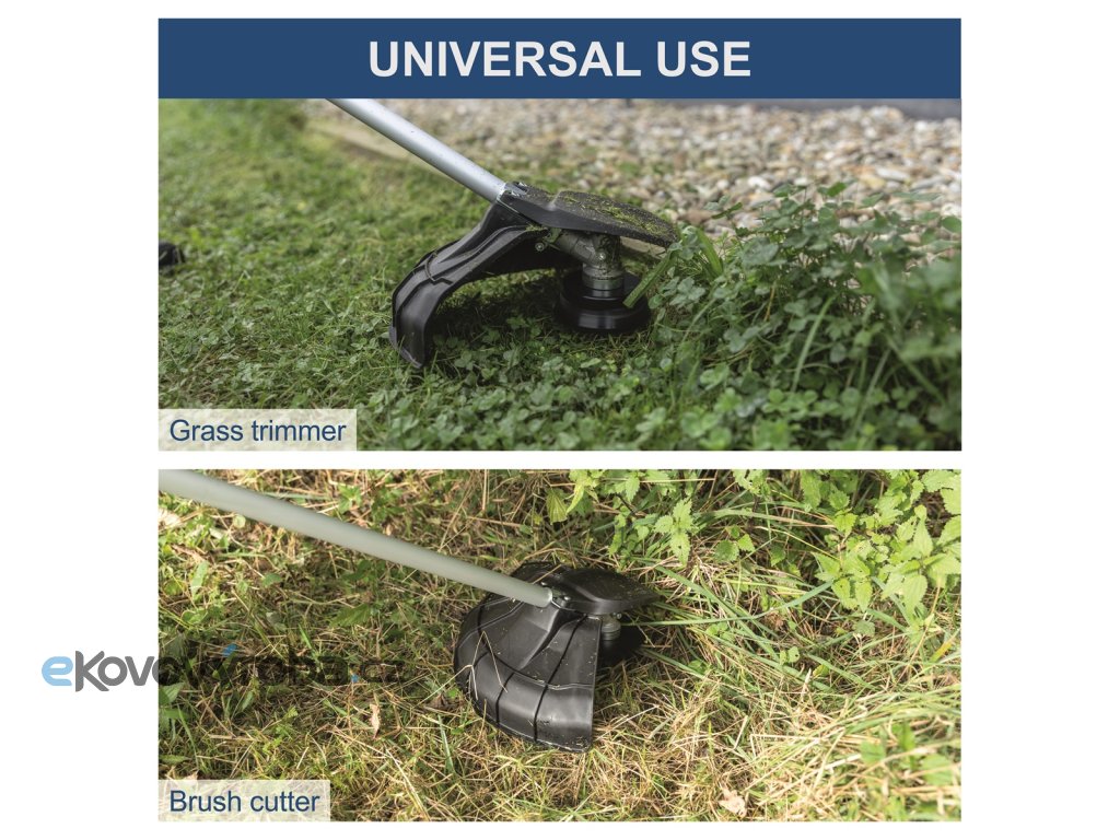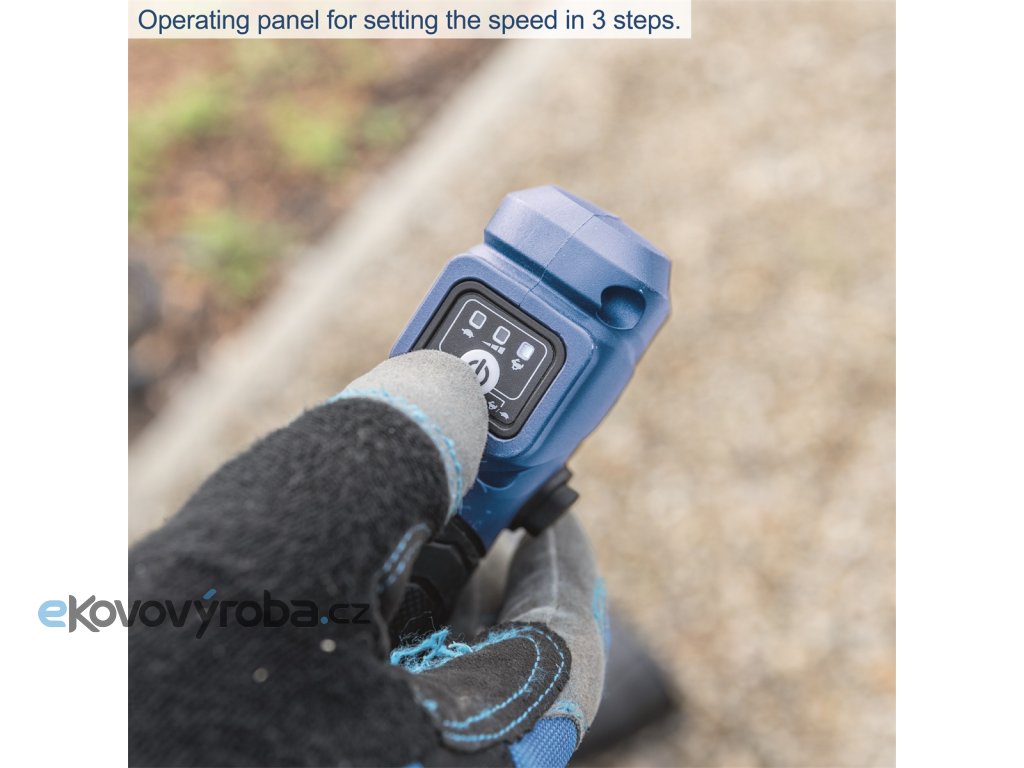 Křovinořez je poháněn silnými bateriemi 2x 20 V (celkem 40 V), které poskytují dostatek energie i pro náročné úkoly v členitějším terénu. S pracovní šířkou 380 mm při použití strunové hlavy a 255 mm při použití nože si poradí jak s trávníkem, tak i s hustým podrostem a drobnějšími nálety. Prémiový trojzubý nůž je navržen pro efektivní sečení i v náročných podmínkách, zatímco funkce Tap’n’Go u strunové hlavy umožňuje snadné poloautomatické prodloužení struny o průměru 1,6 mm. Pro zvýšení pohodlí při práci je křovinořez vybaven nastavitelnými řídítky s protiskluzovým povrchem a antivibračním uložením. Díky třem úrovním rychlosti (4000, 5000 a 6200 ot./min) můžete výkon snadno přizpůsobit konkrétním potřebám. Stroj se dá bez nutnosti použít nářadí demontovat, což výrazně usnadní přepravu nebo skladování. Stroj se dodává bez baterie a nabíječky.