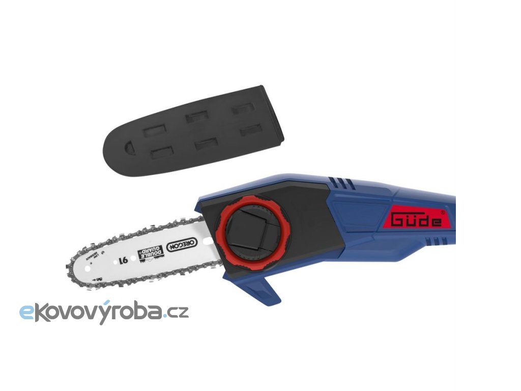 Akumulátorová vyvětvovací pila Güde, určená k prořezávání vzrostlých stromů ze země.