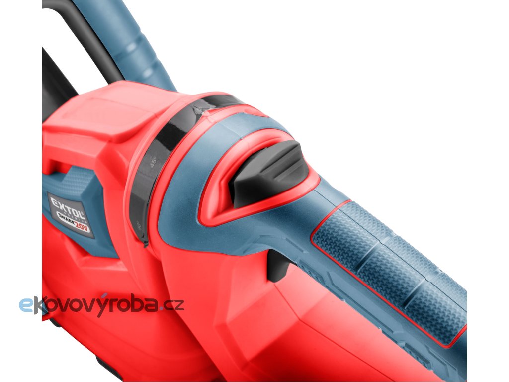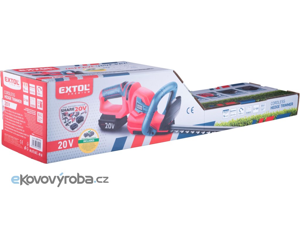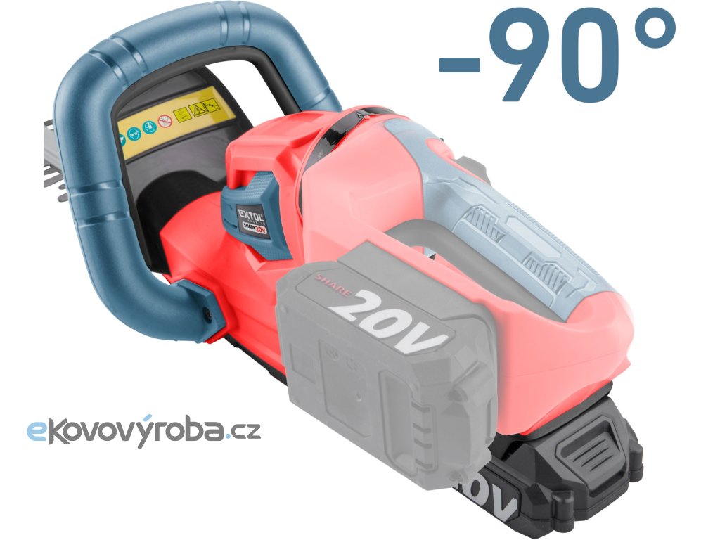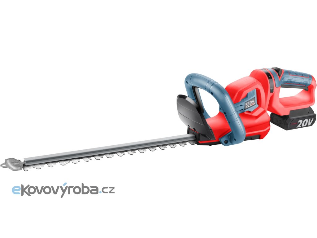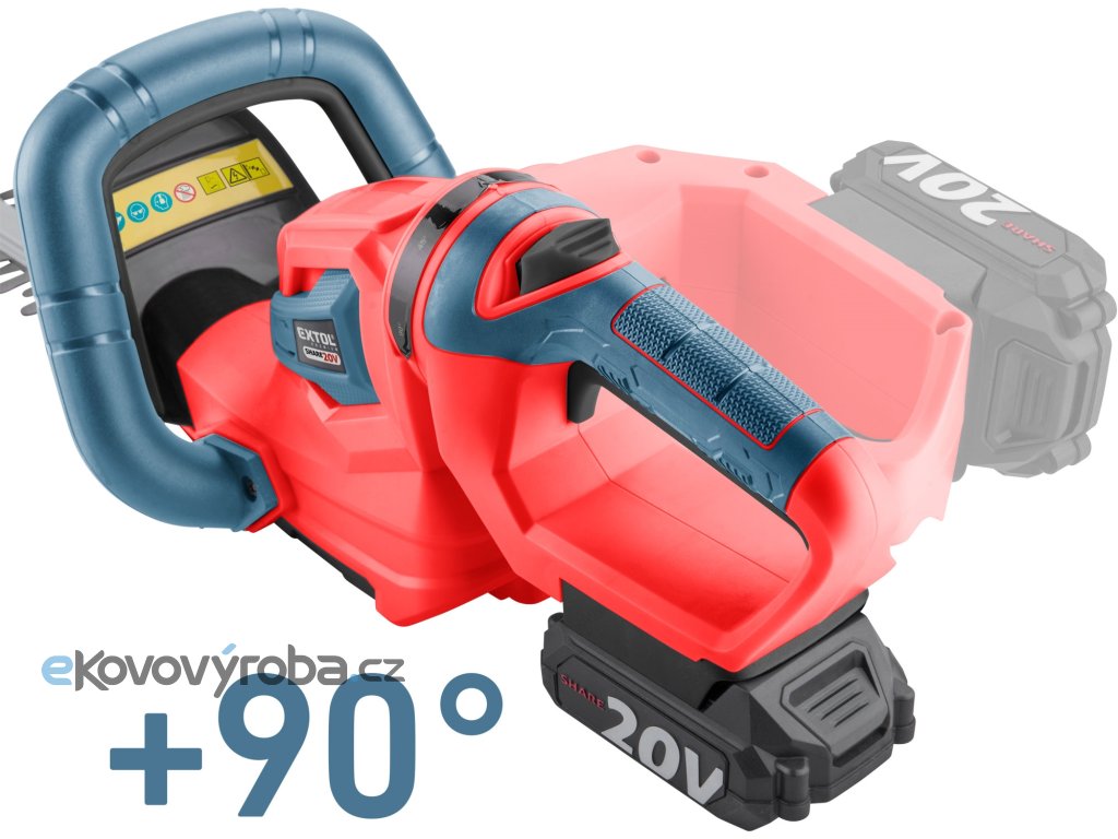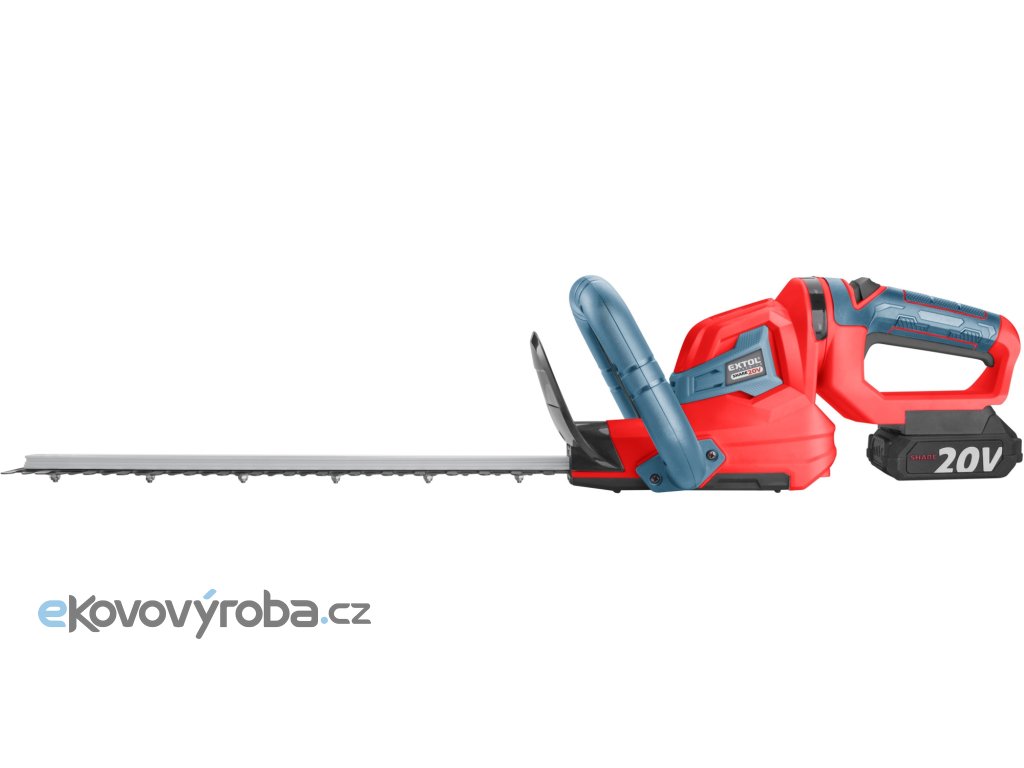 Aku nůžky jsou určeny ke stříhání živého plotu až se středně silnými větvičkami v domácích zahradách. Maximální průměr střihaných větví je 16mm. Ostrá stříhací čepel si snadno poradí s živým plotem a je osazena hliníkovou lištou, která ji chrání před poškozením. Tuto čepel lze otáčet až o 90˚ což usnadňuje stříhání ve vertikální i horizontální poloze. Proti odletujícím kouskům větví je uživatel chráněn pevným plastovým krytem. Stroj je vybaven bezpečnostní pojistkou, která se aktivuje při vyklouznutí z rukou a elektronickou doběhovou brzdou, která zajistí jeho rychlé zastavení. Pogumovaná rukojeť brání vysmeknutí, tlumí vibrace a zpříjemňuje držení při práci. Nůžky jsou navrženy tak, aby byly lehké a ergonomické. Mají dobře vyváženou konstrukci, která snižuje namáhání rukou a zad při delší práci. Díky napájení z baterie již není nutné dávat pozor na napájecí kabel a manipulace s nimi je pohodlnější. Také nikoho nebude rušit hlukem, který vydávají benzínové modely. Aku nůžky nevyžadují složitou péči. Stačí je pravidelně čistit, udržovat ostří čepele a kontrolovat stav baterie. Pro běžnou práci dostačují jeden nebo dva 2Ah akumulátory, které můžete rychle nabít v rychlonabíječce, pro náročnější nebo delší práci doporučujeme větší akumulátory s kapacitou 4–8Ah. Akumulátor má indikátor nabití a lze použít ve všech typech nářadí řady EXTOL SHARE20V. Díky použité Li-ion technologii je ho možné kdykoliv dobíjet, aniž by se tím snižovala jeho kapacita. Li-ion akumulátor ztrácí energii vlivem samovybíjení velmi pomalu a vydrží dlouho nabitý a připravený k použití.
