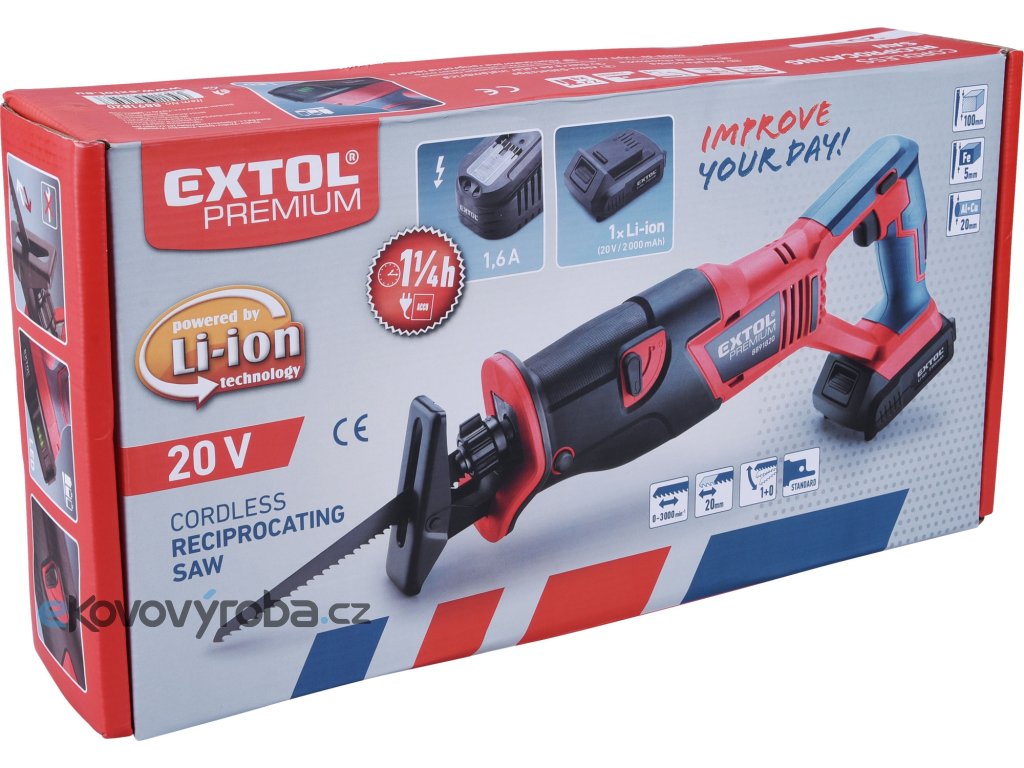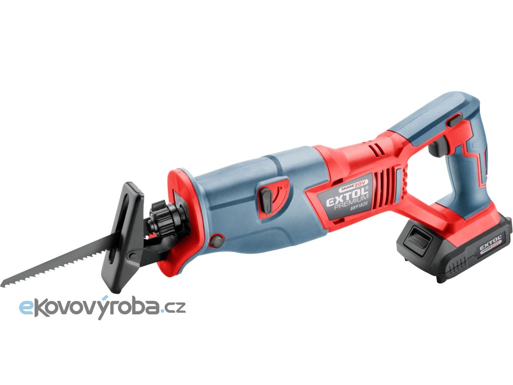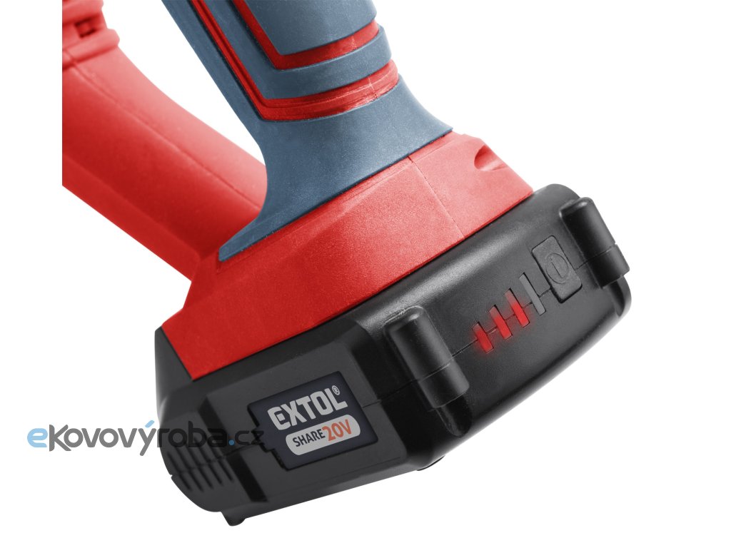 Aku pila ocaska je určena k řezání dřeva, umělé hmoty, kovů a jiných podobných materiálů při práci v dílně, garáži nebo na zahradě. Pružný pilový list umožňuje provádět nejen přímé a obloukové řezy, ale také řezy ve špatně přístupných místech (v rozích, podél zdi), prořezávání stromů. Hlavní výhodou této pily je akumulátorový pohon, který dovoluje si tuto pilu vzít s sebou tam kde s ní potřebujete pracovat, bez ohledu na to, jestli tam je rozvod elektrické energie. Pila má bezpečnostní pojistku proti náhodnému spuštění a je vybavena nastavitelným předkmitem, který si můžete upravit v závislosti na řezaném materiálu. Pro běžnou práci dostačují jeden nebo dva 2000mAh akumulátory, které můžete rychle nabít v rychlonabíječce, pro náročnější nebo delší práci doporučujeme větší akumulátory s kapacitou 4000–8000mAh. Akumulátor lze použít ve všech typech nářadí řady EXTOL SHARE20V. Díky použité Li-ion technologii je ho možné kdykoliv dobíjet, aniž by se tím snižovala jeho kapacita. Li-ion akumulátor ztrácí energii vlivem samovybíjení velmi pomalu a vydrží dlouho nabitý a připravený k použití.