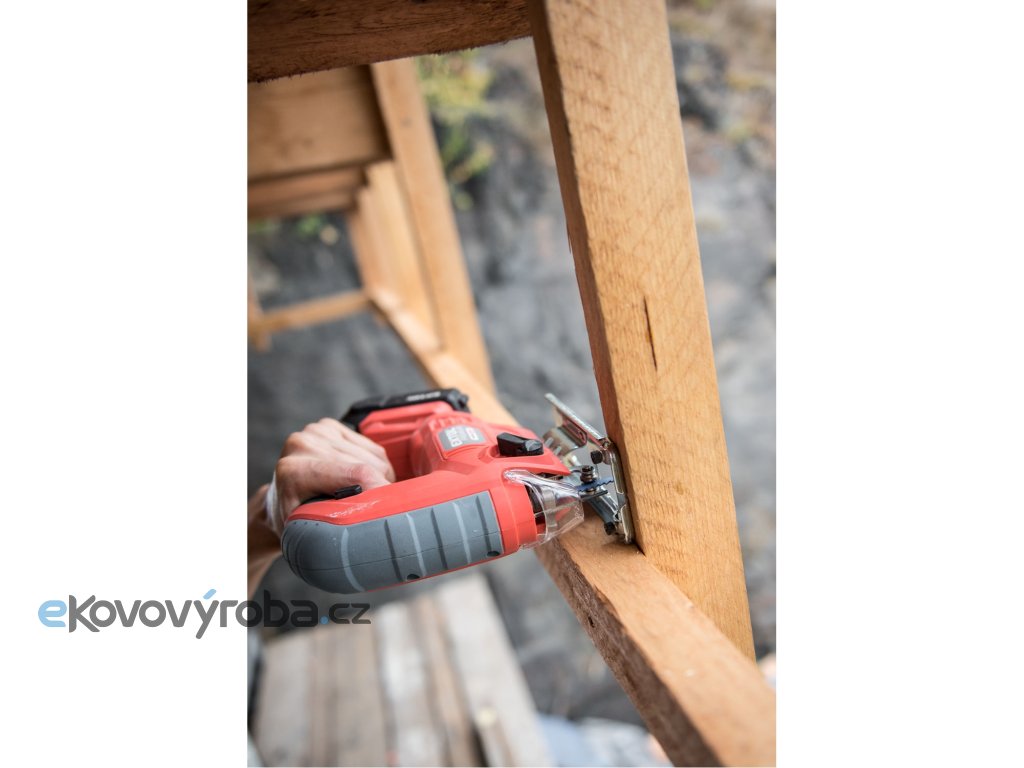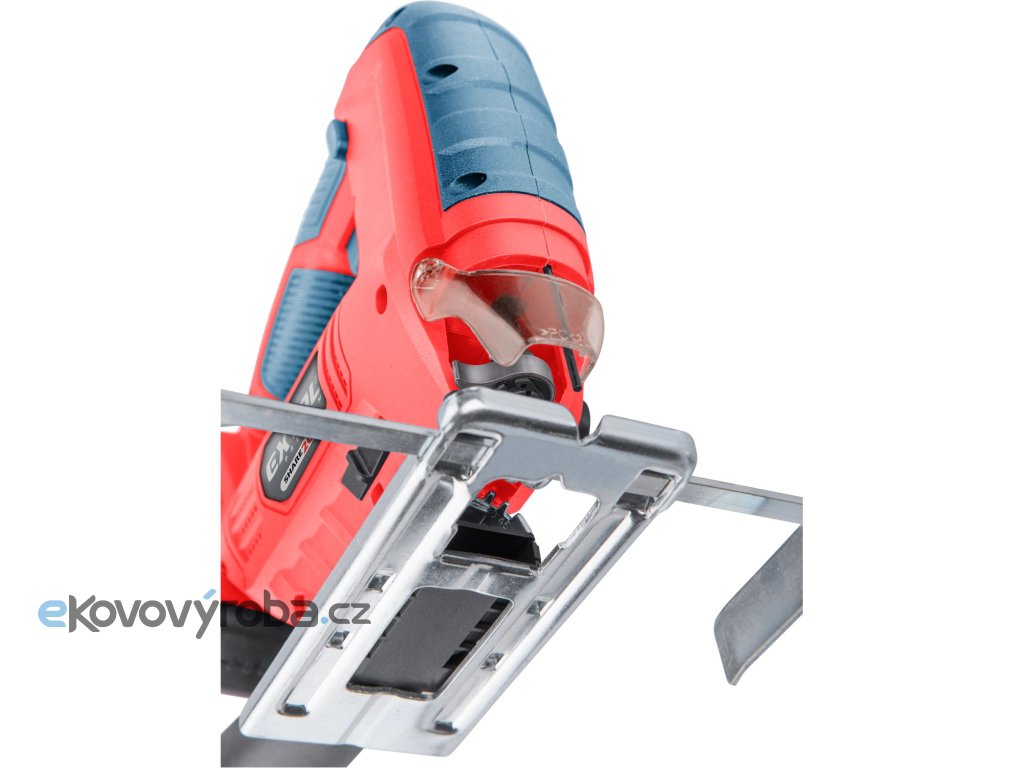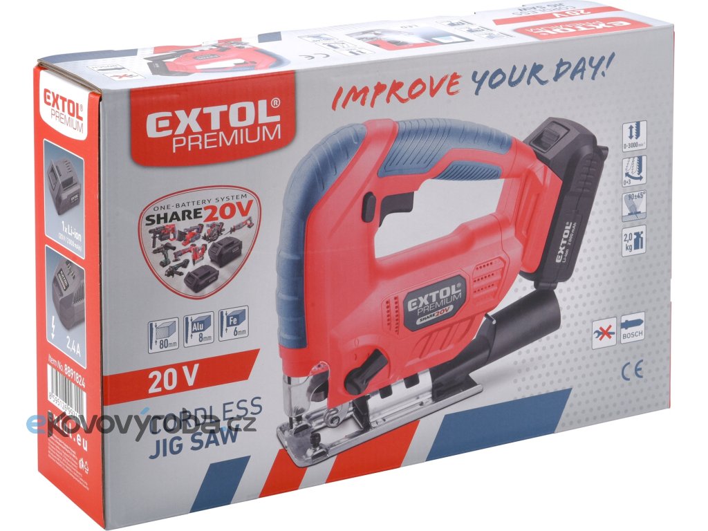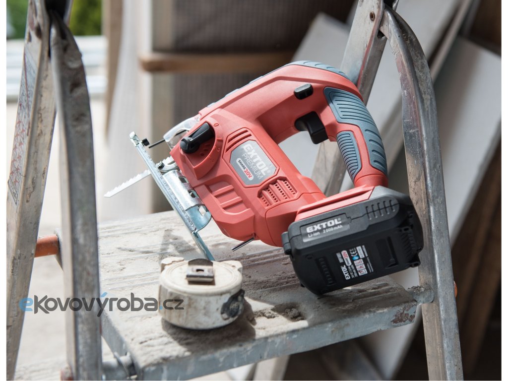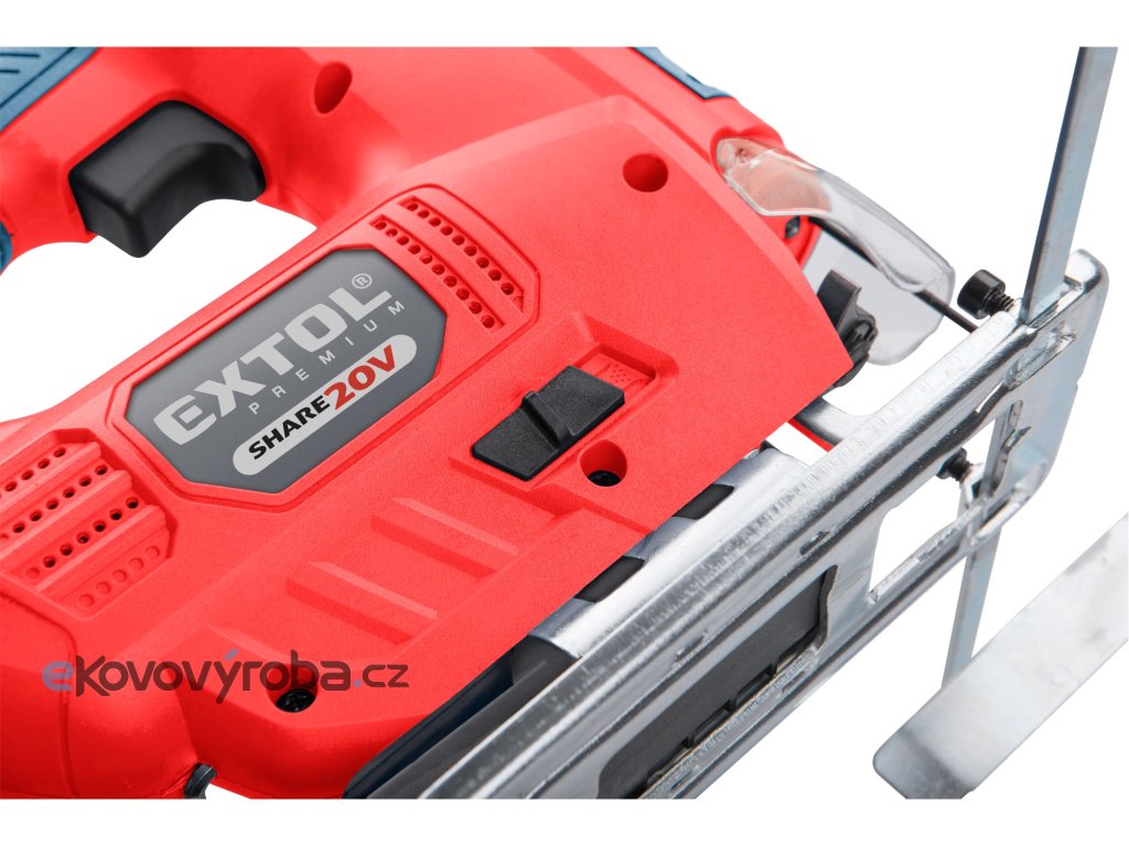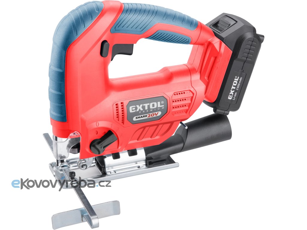 Aku přímočará pila SHARE20V je určena k provádění dělících a tvarových řezů, zejména do dřeva a dřevotřísky a k řezání kovů, plastu, keramických desek a gumy, dále sádrokartonu, cementotřískového materiálu. Díky rychloupínacímu systému lze pilový plátek „Bosch“ vyměnit bez použití nástrojů. Lze použít plátek jakéhokoliv výrobce s tímto úchytem. Standartně při řezání pila odfukuje piliny z místa řezání, ale pokud k ní připojíte vysavač, můžete tento odfuk přepnout a piliny přímo odsávat do vysavače, čímž dosáhnete mnohem čistějšího pracovního místa. Při řezání sádrokartónu a podobných materiálů s velmi jemným prachem je nutno vždy používat odsávání vysavačem. Při práci můžete regulovat rychlost kmitů pomocí spínače a také můžete nastavit sílu předkmitu. Obě nastavení se používají pro změnu stylu a rychlosti řezání v odlišných materiálech. Pro snadnější práci má pila LED světlo osvětlující pracovní místo, které se automaticky zapíná při stisku spínače. Gumová vrstva pokrývající pilu v místě úchopu snižuje množství vibrací, které se přenášejí do rukou a snižuje únavu při práci. Pro běžnou práci dostačují jeden nebo dva 2000mAh akumulátory, které můžete rychle nabít v rychlonabíječce, pro náročnější nebo delší práci doporučujeme větší akumulátory s kapacitou 4000–8000mAh. Akumulátor lze použít ve všech typech nářadí řady EXTOL SHARE20V. Díky použité Li-ion technologii je ho možné kdykoliv dobíjet, aniž by se tím snižovala jeho kapacita. Li-ion akumulátor ztrácí energii vlivem samovybíjení velmi pomalu a vydrží dlouho nabitý a připravený k použití.