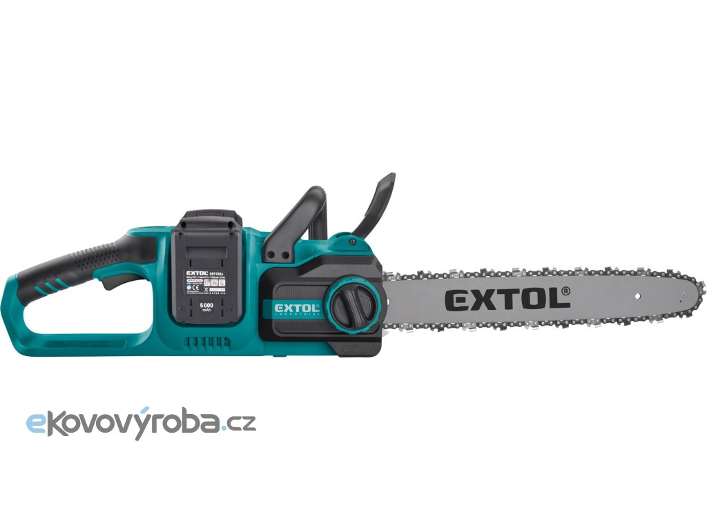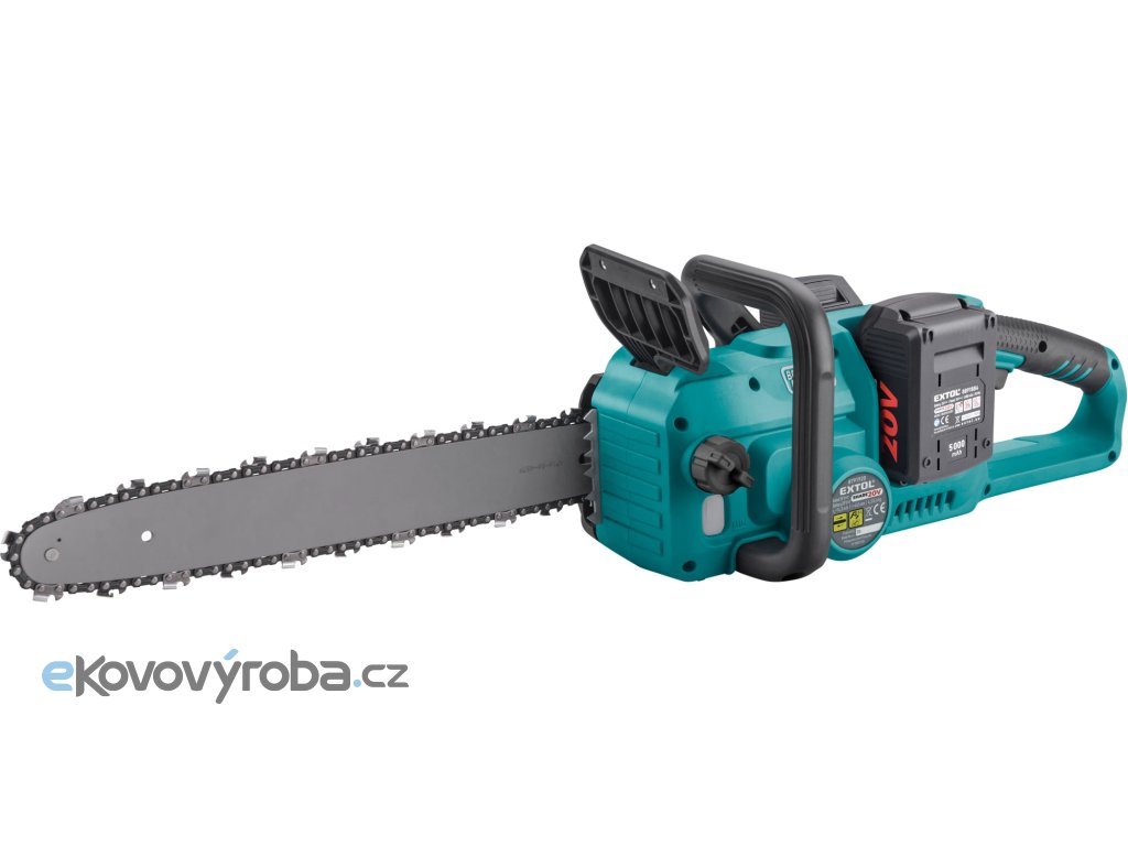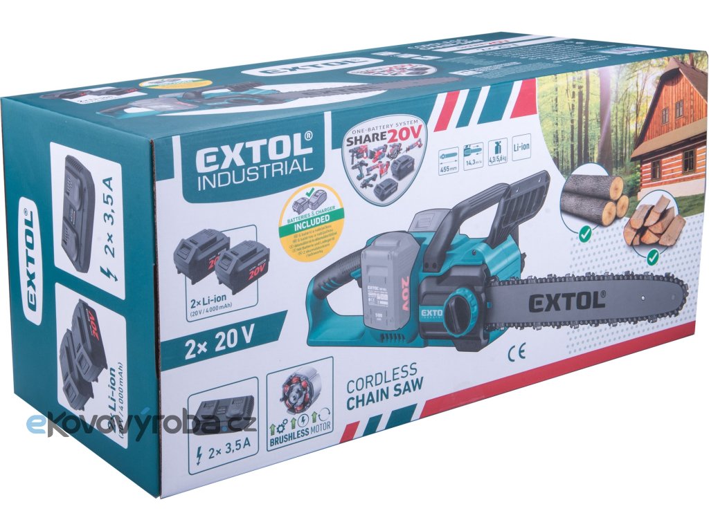 Silná aku řetězová pila je určena k provádění zkracovacích řezů dřeva, jako je např. řezání trámů, kácení stromů s přiměřeně silným kmenem, k odvětvování kmenů, k řezání kmenů či silných větví na palivové dřevo. Aku řetězová pila spojuje výhody elektrických pil – nízký hluk, jednoduchost obsluhy a údržby se svobodou pohybu u benzínových pil. Je vybavena kvalitní vodící lištou a pilovým řetězem. Mazaní řetězu za chodu je automaticky zajišťováno čerpadlem. Pohon zajišťuje nejmodernější „brushless' motor. Tento nový typ motoru eliminuje tření a ztráty energie při provozu, čímž dosahuje vyšší životnosti a výkonu, při menší spotřebě el. energie než klasické motory s uhlíkovými kartáči. Vysoký výkon brushless motoru se velmi dobře využije při zpracování dřeva, kdy dovoluje chod pily i při rychlejším řezání. Pila je také vybavena beznástrojovým systémem pro snadnou a rychlou výměnu řetězu a mechanismem pro jednoduché vypnutí řetězu. Vysokou bezpečnost zajišťuje bezpečnostní pojistka, která se aktivuje při vyklouznutí z rukou nebo při “kopnutí” pily a elektronickou doběhovou brzdou, která zajistí jeho rychlé zastavení. Pogumovaná rukojeť brání vysmeknutí, tlumí vibrace a zpříjemňuje držení při práci. Na spodní straně pily je otvor pro jednoduché zavěšení na zeď. Akumulátor je vybaven ukazatelem nabití, což umožňuje uživateli si rozvrhnout délku práce a dát si včas nabít další akumulátor. Pro běžnou práci dostačují dva 4Ah akumulátory, které můžete rychle nabít v rychlonabíječce, pro náročnější nebo delší práci doporučujeme větší akumulátory s kapacitou 6–8Ah. Akumulátor lze použít ve všech typech nářadí řady EXTOL SHARE20V. Díky použité Li-ion technologii je ho možné kdykoliv dobíjet, aniž by se tím snižovala jeho kapacita. Li-ion akumulátor ztrácí energii vlivem samovybíjení velmi pomalu a vydrží dlouho nabitý a připravený k použití.