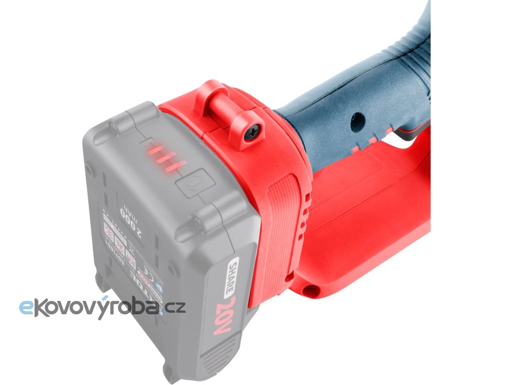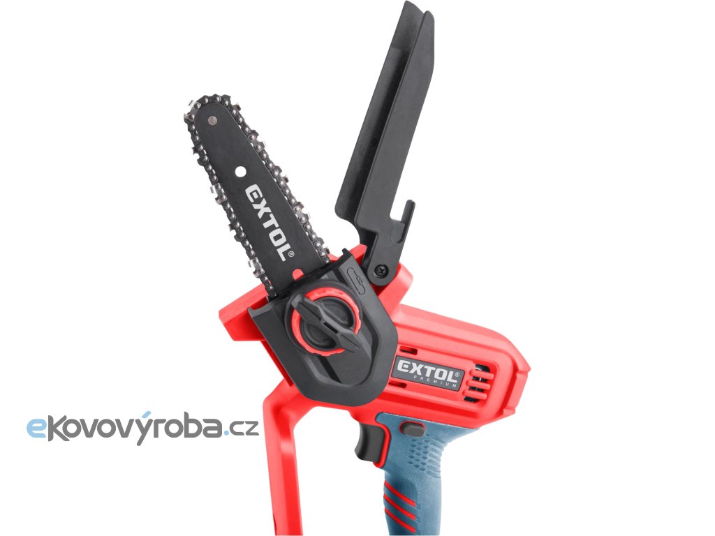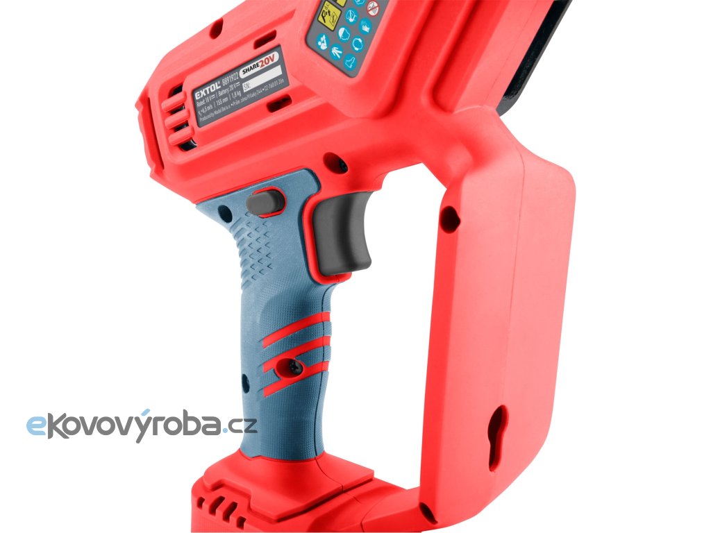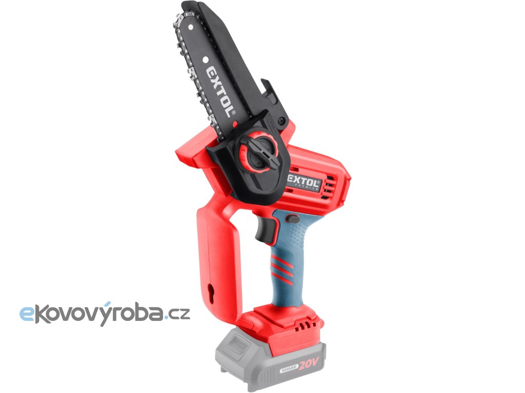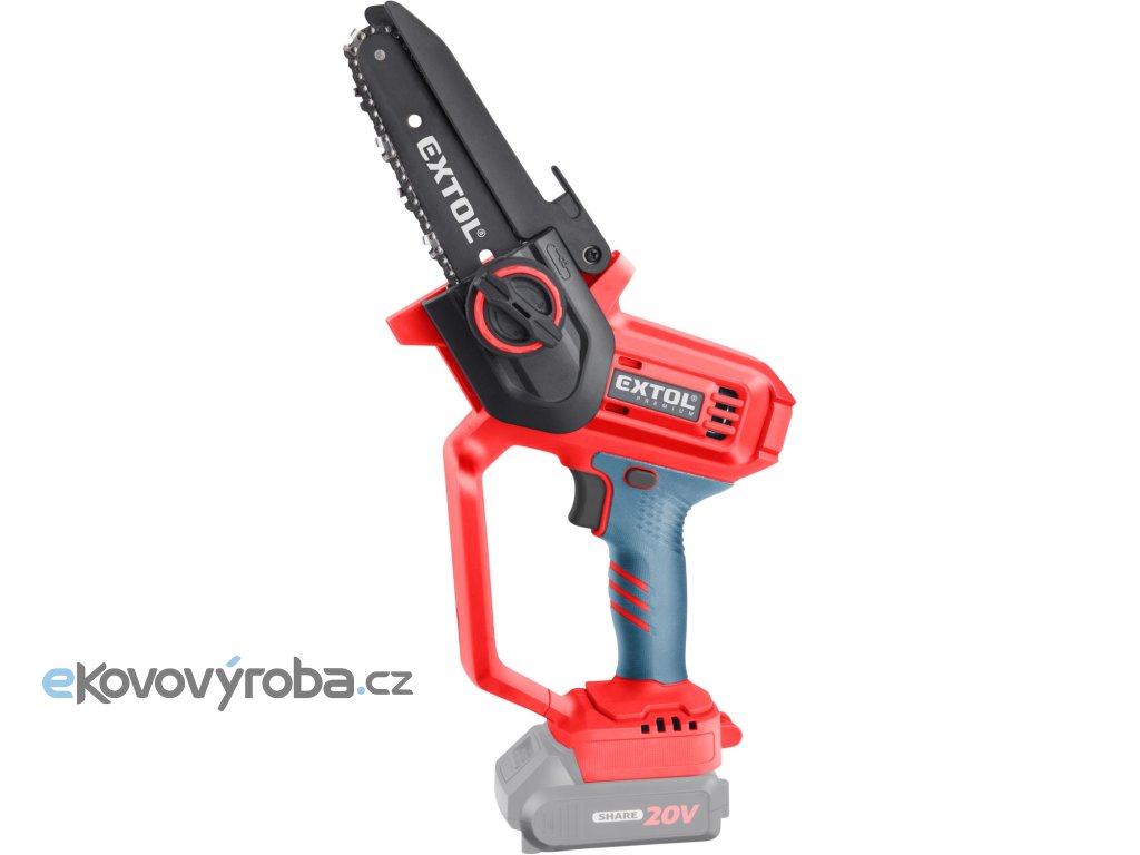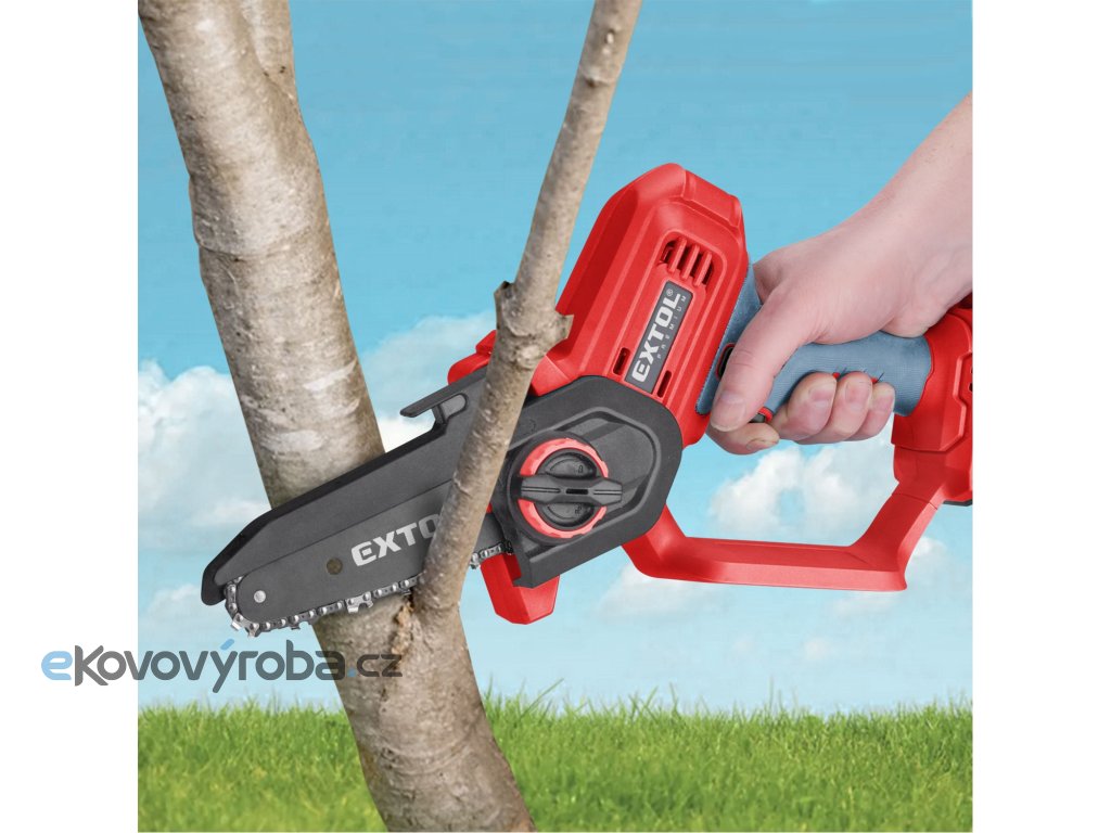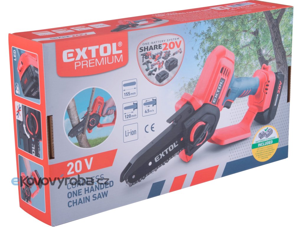 Jednoruční řetězová aku pila je určena k prořezávání stromů a keřů a pro drobné zkracovací řezy dřeva na zahradě, v dílně apod. Aku řetězová pila spojuje výhody elektrických pil – nízký hluk, jednoduchost obsluhy a údržby se svobodou pohybu u benzínových pil. Tato malá aku pila váží jen 1,8kg a je dostatečně robustní na to, aby si snadno poradila s větvemi, ale zároveň dostatečně lehká na to, aby se dala ovládat jednou rukou. Je vybavena kvalitní vodící lištou a pilovým řetězem. Pila má také systém pro snadnou a rychlou výměnu řetězu a mechanismem pro jednoduché vypnutí řetězu. Vysokou bezpečnost zajišťují tři prvky: horní chránič řetězu, chránič rukou, který vás chrání před pořezáním, poškrábáním a škrábanci a spínačem s pojistkou zabraňující náhodnému spuštění. Pogumovaná rukojeť brání vysmeknutí, tlumí vibrace a zpříjemňuje držení při práci. Akumulátor je vybaven ukazatelem nabití, což umožňuje uživateli si rozvrhnout délku práce a dát si včas nabít další akumulátor. Pro běžnou práci dostačují jeden nebo dva 2Ah akumulátory, které můžete rychle nabít v rychlonabíječce, pro náročnější nebo delší práci doporučujeme větší akumulátory s kapacitou 4–8Ah. Akumulátor lze použít ve všech typech nářadí řady EXTOL SHARE20V. Díky použité Li-ion technologii je ho možné kdykoliv dobíjet, aniž by se tím snižovala jeho kapacita. Li-ion akumulátor ztrácí energii vlivem samovybíjení velmi pomalu a vydrží dlouho nabitý a připravený k použití.