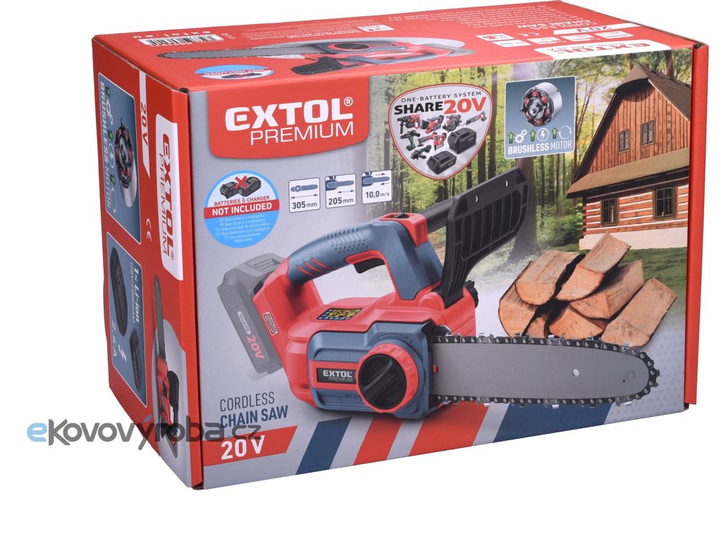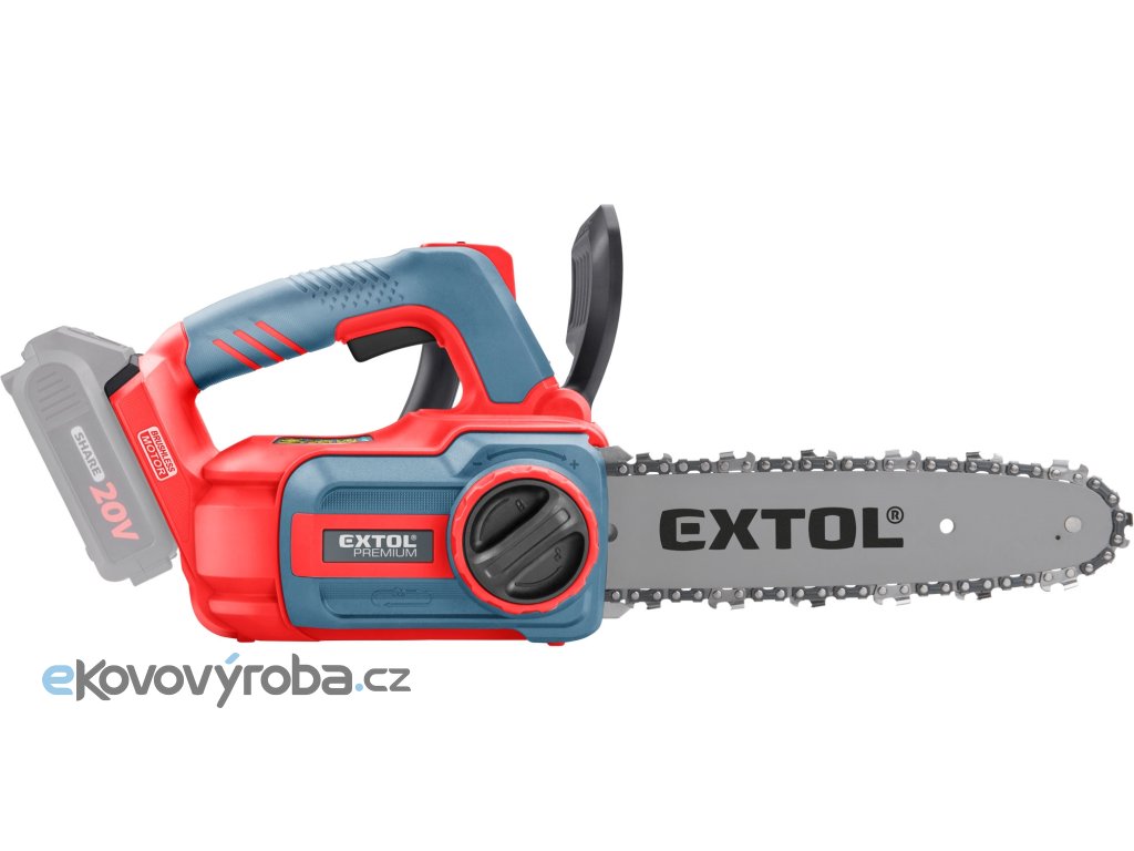 Řetězová aku pila je určena k provádění zkracovacích řezů dřeva, jako je např. řezání trámů, kácení stromů s přiměřeně silným kmenem, k odvětvování kmenů, k řezání kmenů či silných větví na palivové dřevo. Aku řetězová pila spojuje výhody elektrických pil — nízký hluk, jednoduchost obsluhy a údržby se svobodou pohybu u benzínových pil. Je vybavena kvalitní vodící lištou a pilovým řetězem. Mazaní řetězu za chodu je automaticky zajišťováno čerpadlem. Pohon zajišťuje nejmodernější „brushless" motor. Tento nový typ motoru má vyšší životnost, je výkonnější a má menší spotřebu el. energie než klasické motory s uhlíkovými kartáči. Vysoký výkon brushless motoru se velmi dobře využije při zpracování dřeva, kdy dovoluje chod pily i při rychlejším řezání. Pila je také vybavena systémem pro snadnou a rychlou výměnu řetězu a mechanismem pro jednoduché vypnutí řetězu. Vysokou bezpečnost zajišťuje bezpečnostní pojistka, která se aktivuje při vyklouznutí z rukou nebo při “kopnutí” pily a elektronickou doběhovou brzdou, která zajistí jeho rychlé zastavení. Pogumovaná rukojeť brání vysmeknutí, tlumí vibrace a zpříjemňuje držení při práci. Na spodní straně pily je otvor pro jednoduché zavěšení na zeď. Akumulátor je vybaven ukazatelem nabití, což umožňuje uživateli si rozvrhnout délku práce a dát si včas nabít další akumulátor. Pro běžnou práci dostačují jeden nebo dva 2Ah akumulátory, které můžete rychle nabít v rychlonabíječce, pro náročnější nebo delší práci doporučujeme větší akumulátory s kapacitou 4–8Ah. Akumulátor lze použít ve všech typech nářadí řady EXTOL SHARE20V. Díky použité Li-ion technologii je ho možné kdykoliv dobíjet, aniž by se tím snižovala jeho kapacita. Li-ion akumulátor ztrácí energii vlivem samovybíjení velmi pomalu a vydrží dlouho nabitý a připravený k použití.