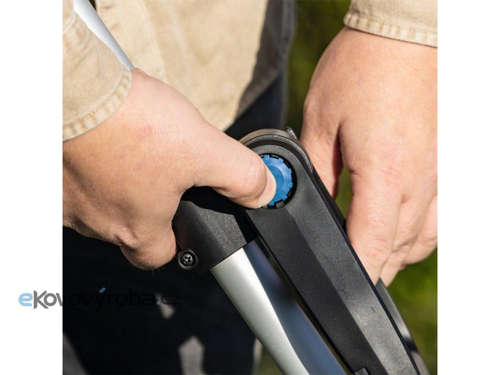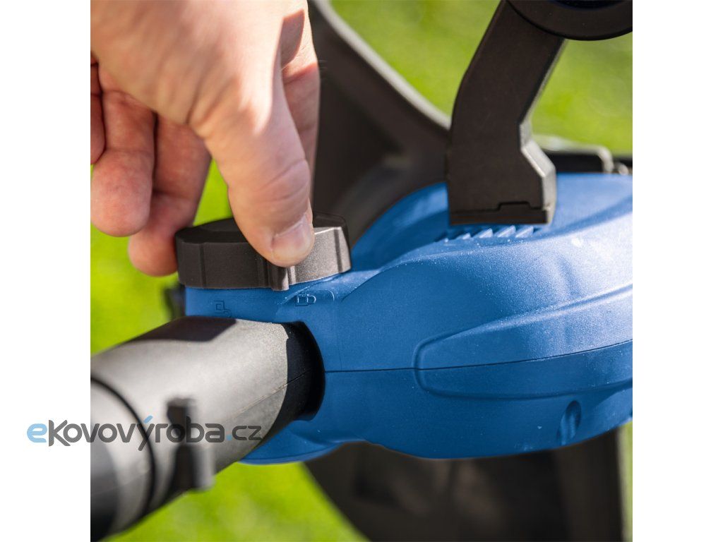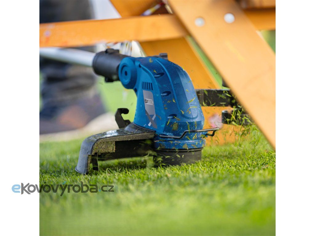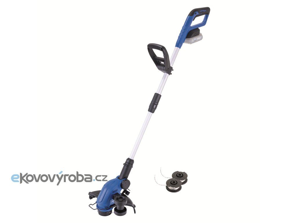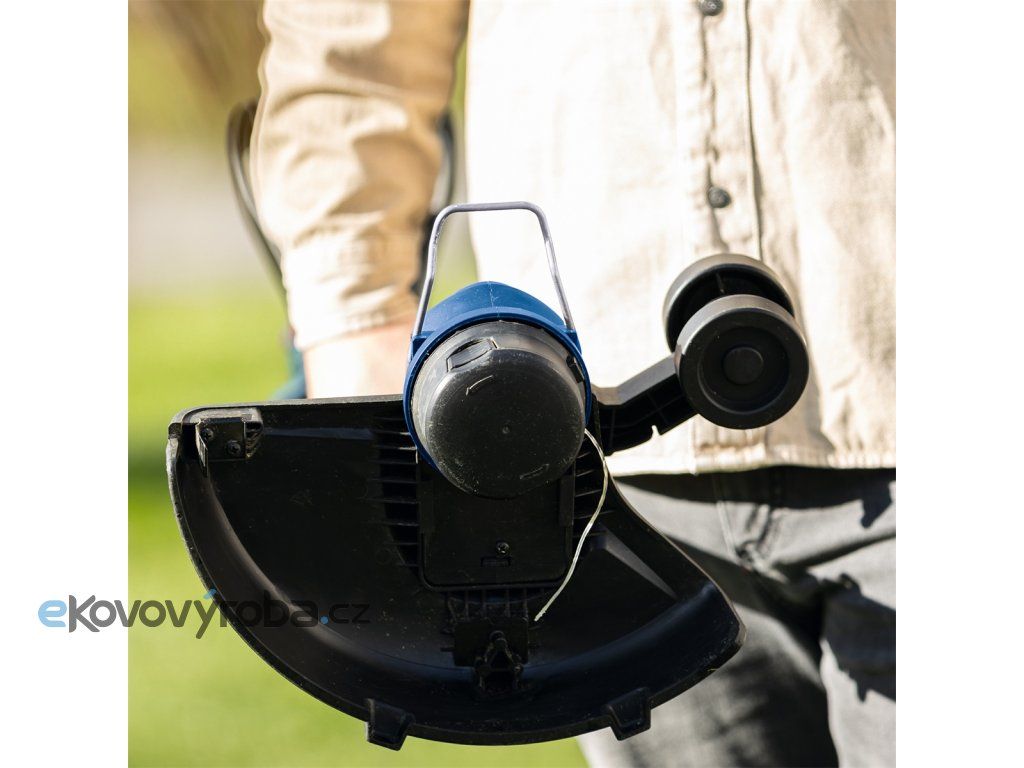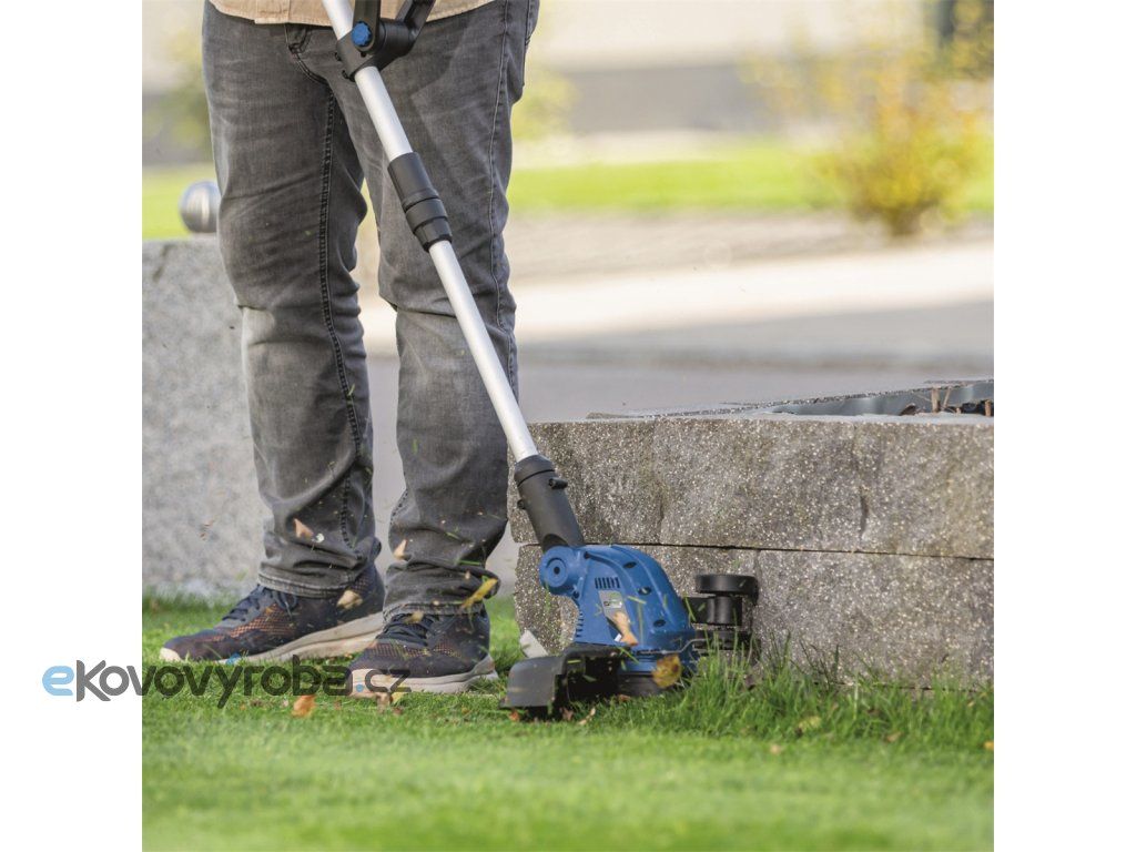Stroj má záběr skvělých 30 cm, je vybaven bezpečnostním spínačem, vodícím kolečkem a výklopnou ochrannou bránící poškození rostlin a dalších citlivých objektů. Hlava je kvůli stříhání okrajů otočná o 90° a sklon lze rovněž upravit tak, aby se dalo sekat na hůře přístupných místech (pod lavičkou apod.). Rukojeť je měkčená a protiskluzová, přední je výškově nastavitelná. Podle potřeby lze teleskopicky nastavit délku stroje až na 270 mm.