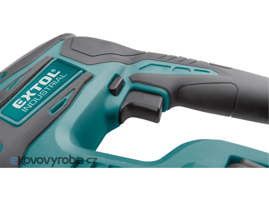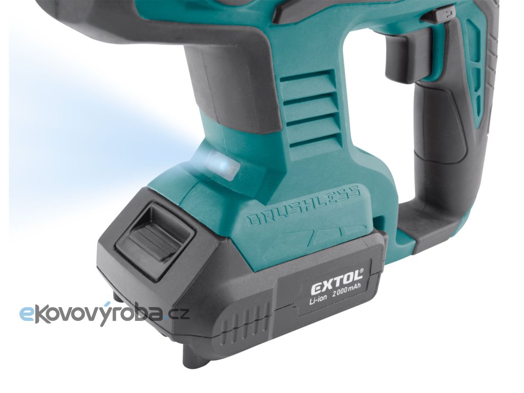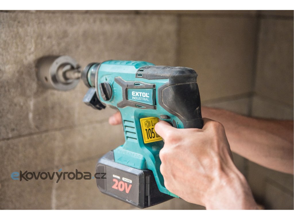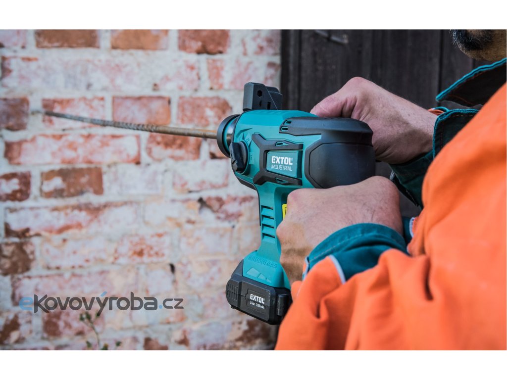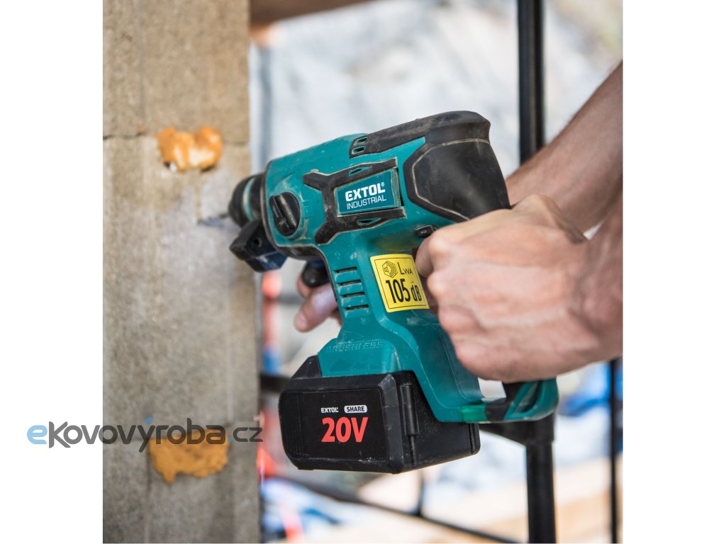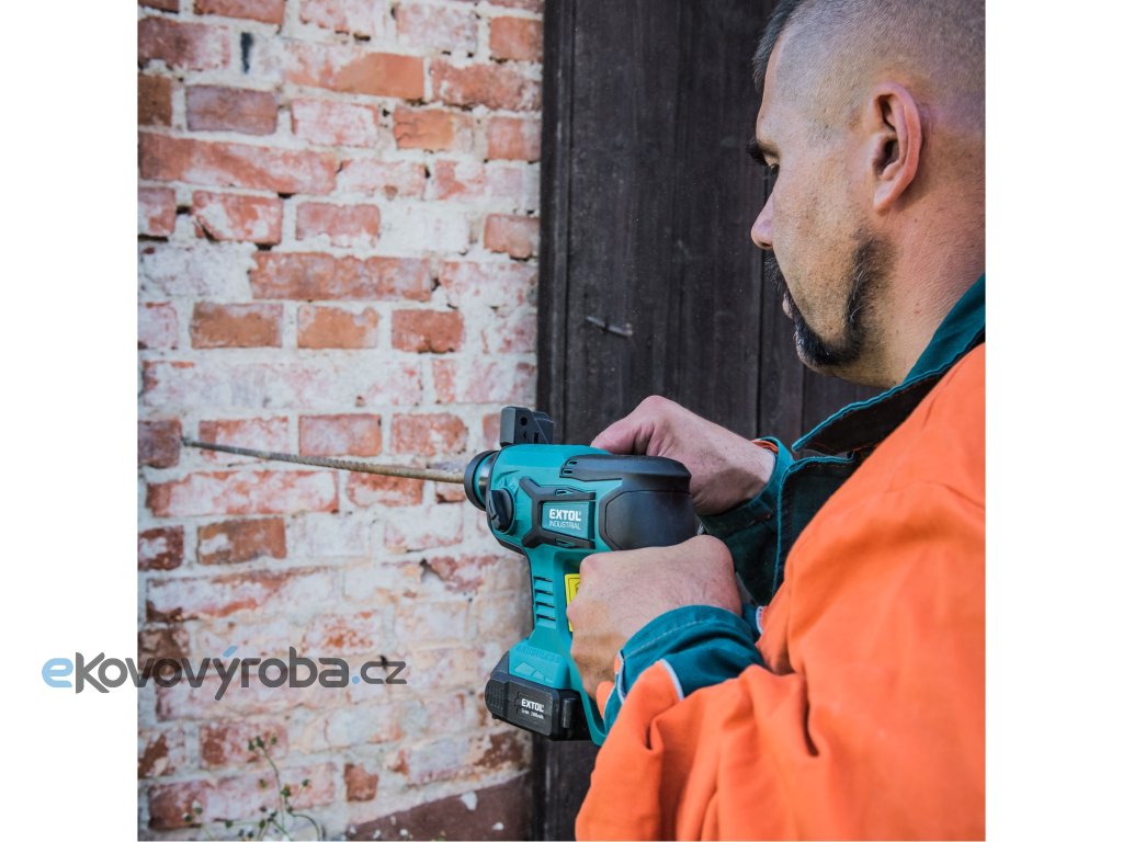Aku vrtací kladivo je určeno k rychlému vrtání do cihel a betonu pomocí vrtáků s SDS plus stopkou a menším sekacím pracem. Kladivo je poháněno nejmodernějším „brushless" motorem. Tento nový typ motoru má vyšší životnost, je výkonnější a má menší spotřebu el. energie než klasické motory s uhlíkovými kartáči. Díky pneumatickému příklepovému systému je schopno vrtat mnohem rychleji a efektivněji než příklepové vrtačky. Kladivo má zámek sekáče, takže si můžete před sekáním sekáč nastavit do patřičné polohy a při sekání bude kladivo udržovat sekáč v této poloze. Jeho hlavní výhodou je akumulátorový pohon, který dovoluje si vzít kladivo s sebou tam kde s ním potřebujete pracovat, bez ohledu na to, jestli tam je rozvod elektrické energie. Kladivo je vybaveno zpětným chodem pro snadné vytažení zaseklého vrtáku a regulací rychlosti, kterou lze využít dle vrtaného materiálu. Integrované LED osvětlení má zpožděné vypnutí a svítí ještě několik vteřin po vypnutí kladiva. Pro běžnou práci dostačují jeden nebo dva 2000mAh akumulátory, které můžete rychle nabít v rychlonabíječce, pro náročnější nebo delší práci doporučujeme větší akumulátory s kapacitou 4000–8000mAh. Akumulátor lze použít ve všech typech nářadí řady EXTOL SHARE20V. Díky použité Li-ion technologii je ho možné kdykoliv dobíjet, aniž by se tím snižovala jeho kapacita. Li-ion akumulátor ztrácí energii vlivem samovybíjení velmi pomalu a vydrží dlouho nabitý a připravený k použití.