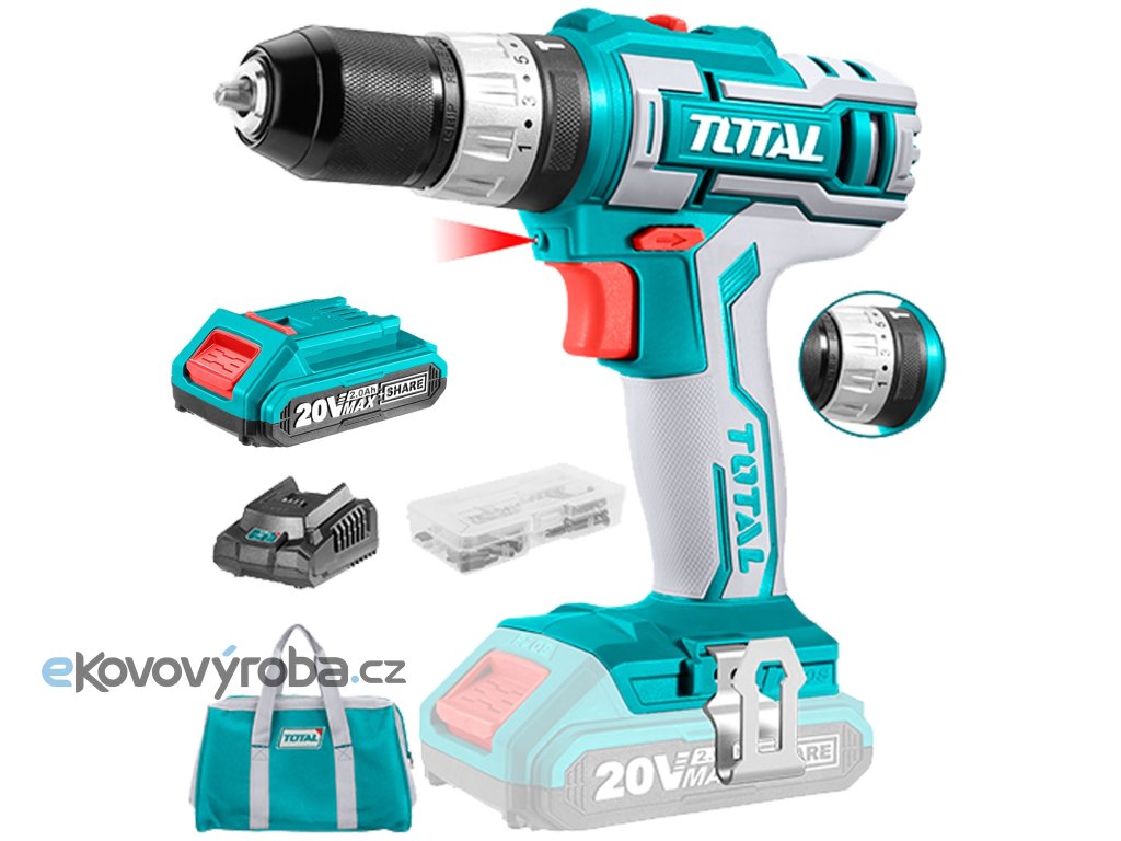 Výkonný vrtací šroubovák AKU disponuje 18 stupňů utahovacích momentů, vrtání a vrtání s příklepem. Šroubovák má 45NM, což je více než dostatečné pro poloprofesionální použití. Sestava má k dispozici dvě baterie s kapacitou 2000mAh, rychlonabíječku a 50ks příslušenství. AKU vrtací šroubovák s příklepem je vybaven protiskluzovou úpravou rukojeti a integrovaným LED světlem. Rovněž je vybavena dvoustupňovou mechanickou přepínací rychlostí. Samozřejmostí je rychloupínací hlava a Auto-lock funkce. Tento výrobek patří do kategorie P20S.