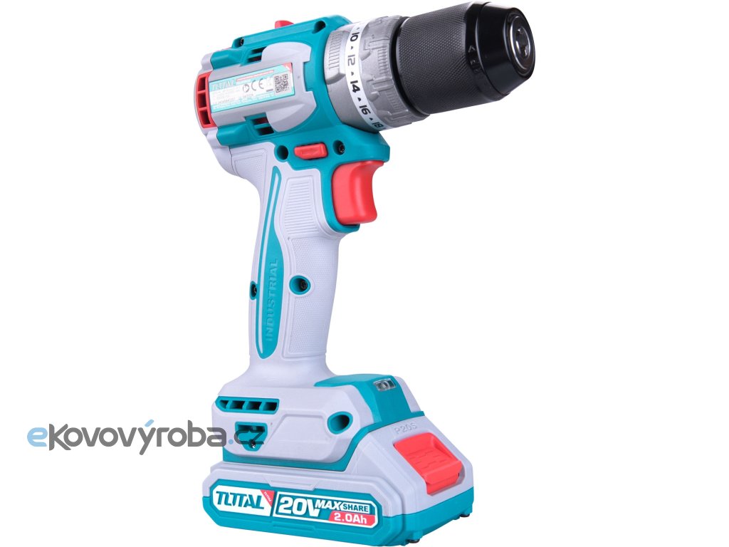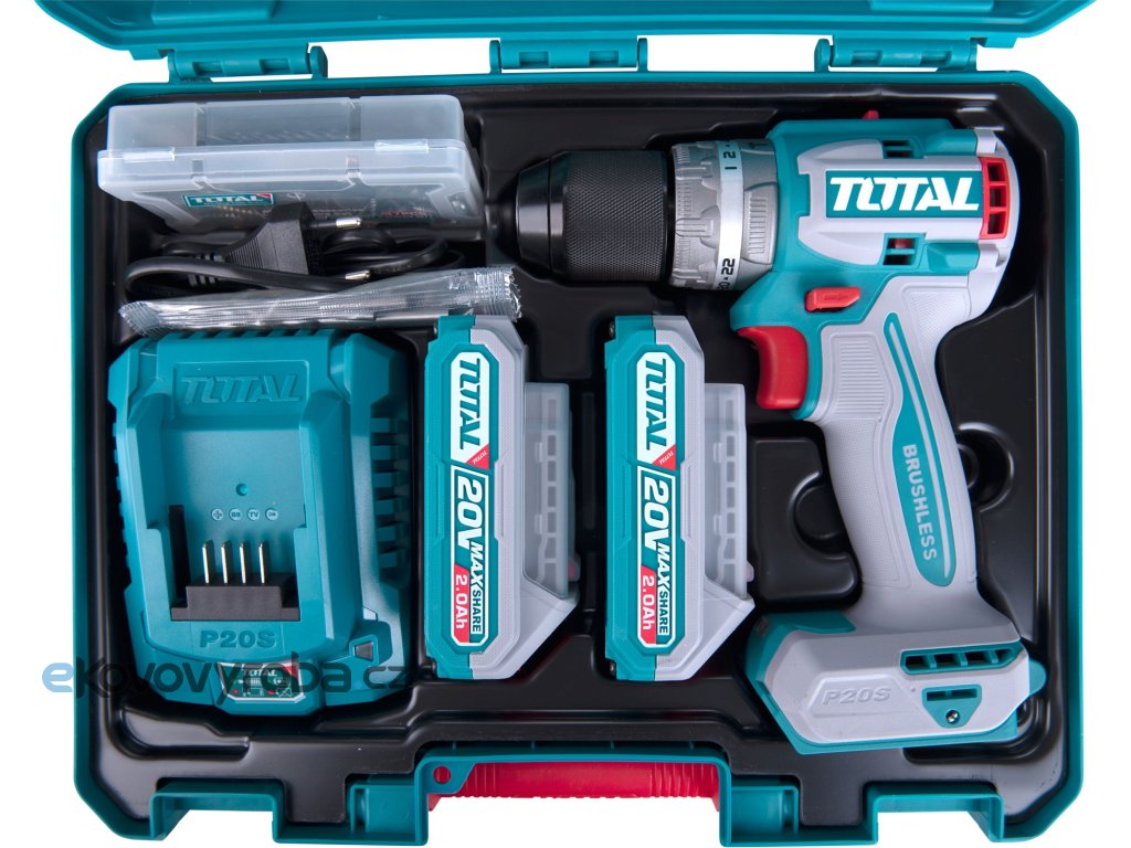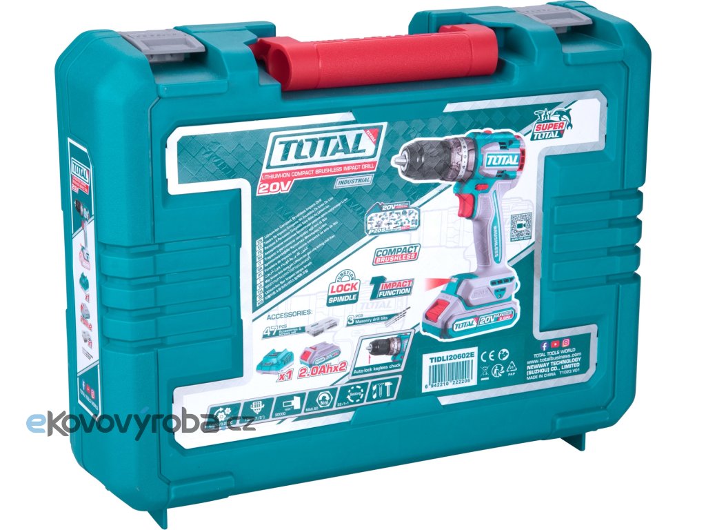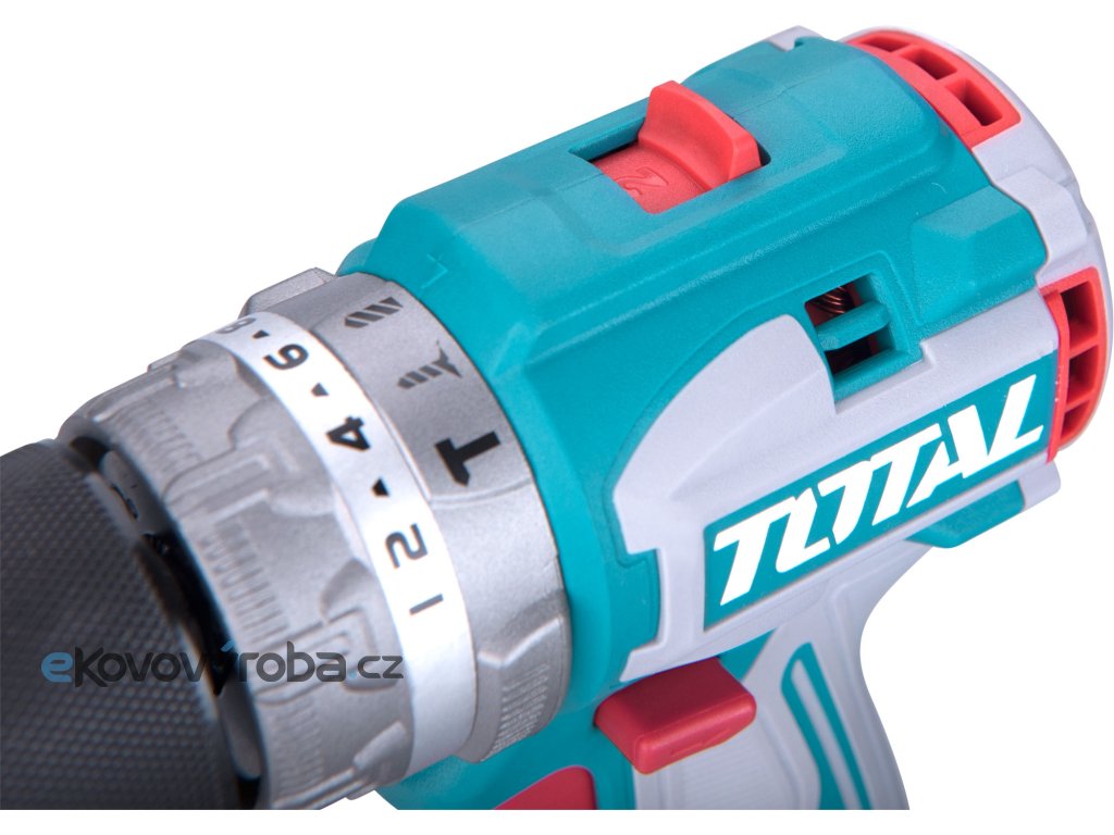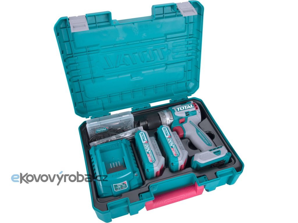 Nový typ aku vrtacího šroubováku s příklepem z řady industrial je vhodný pro všechny běžné pracovní úkoly a projekty v domácnosti, dílně a zahradě. Šroubovák má celokovovou hlavu, 22 stupňů utahovacích momentů + vrtání a vrtání s příklepem. Šroubovák má nový typ ergonomické antivibrační rukojeti pro příjemný úchyt a práci. Součástí šroubováku jsou dvě baterie 2000mAh a jeden kus rychlonabíječky. Jak baterie, tak nabíječka je kompatibilní se všemi stroji Total využívajícími baterie. Vše je uloženo v plastovém kufru pro snadnou přepravu. Je určen pro:- vrtání bez příklepu do dřeva, plastu i kovů- vrtání s příklepem do zdiva- utahování a povolování šroubů nebo vrutů• Nepřítomnost napájecího kabelu poskytuje svobodu a komfort při práci a manipulaci s nářadím. Nářadí lze tak s výhodou použít pro práci v místech, kde není možné použít elektrické nářadí s napájecím kabelem z důvodu nedostupnosti distribuční elektrické sítě. Toto nářadí je vybaveno systémem ochrany nářadí a akumulátoru, který v případě hrozícího přetížení nebo přehřátí automaticky odpojí napájení motoru. Systém tak chrání životnost nářadí i akumulátoru.