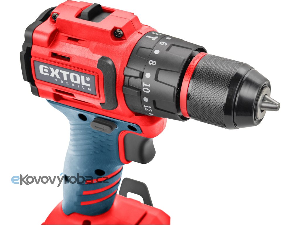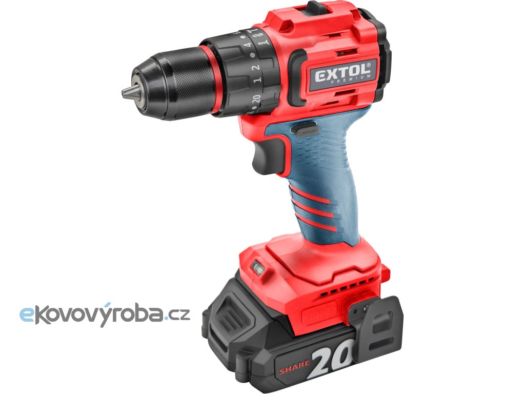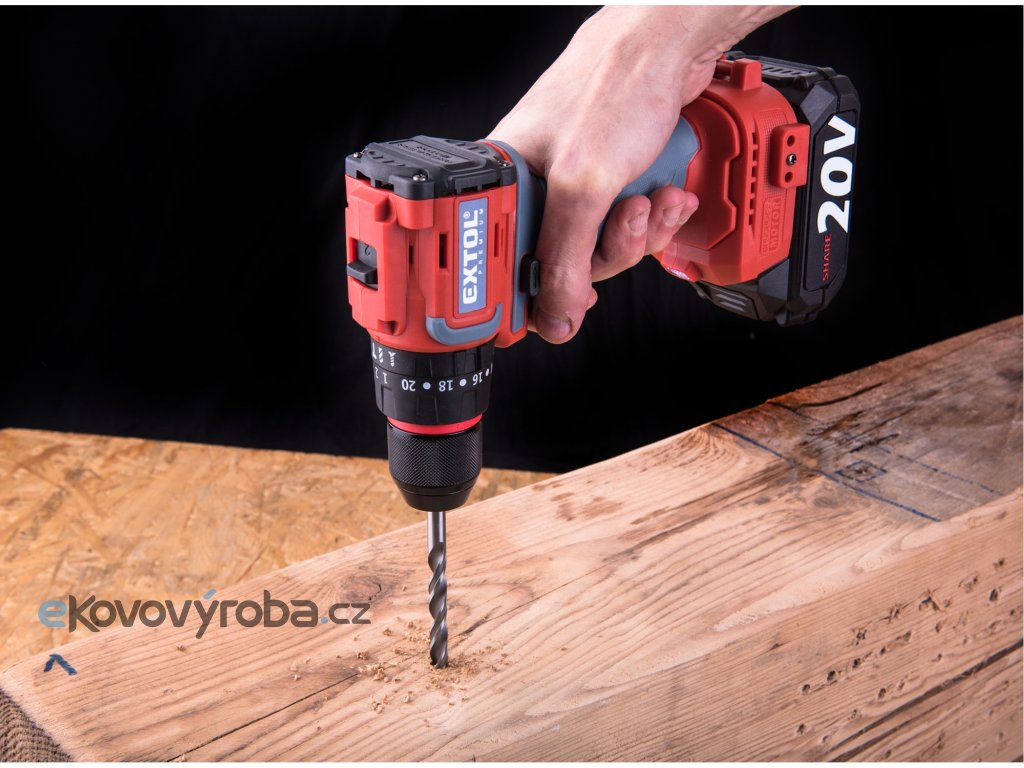 Lehký a výkonný dvourychlostní vrtací aku šroubovák s příklepem Vám poskytuje vysoký vrtací výkon při vrtání do široké škály materiálů – ocel, kovy, dřevo, plast, ale s příklepem také do zdiva. Je určen pro náročné práce a díky svému příjemnému designu se s ním velmi dobře pracuje i při dlouhodobém používání. Vrtačka je poháněná nejmodernějším „brushless" motorem. Tento nový typ motoru má vyšší životnost, je výkonnější a má menší spotřebu el. energie než klasické motory s uhlíkovými kartáči. Celokovová převodovka s 5ozubenými kolečky je speciálně navržena pro vysoký kroutící moment a zajišťuje bezchybný chod i při vysoké zátěži. Vrtáky se upínají do kvalitního celokovového sklíčidla s aretací. Díky plynulému nastavení momentů, lze využít celý rozsah stupnice a nejen vyznačených 20 stupňů. Vrtačka má 3 režimy práce: vrtání, šroubování a vrtání s příklepem. Mechanický příklep je vynikající pro vrtání do tvrdších materiálů. Integrovaná LED svítilna umístněná na spodní části rukojeti osvětluje pracovní prostor a pro zlepšení orientace v tmavých prostorech má zpožděné vypnutí. Pro běžnou práci dostačují jeden nebo dva 2Ah akumulátory, které můžete rychle nabít v rychlonabíječce, pro náročnější nebo delší práci doporučujeme větší akumulátory s kapacitou 4–8Ah. Akumulátor lze použít ve všech typech nářadí řady EXTOL SHARE20V. Díky použité Li-ion technologii je ho možné kdykoliv dobíjet, aniž by se tím snižovala jeho kapacita. Li-ion akumulátor ztrácí energii vlivem samovybíjení velmi pomalu a vydrží dlouho nabitý a připravený k použití.