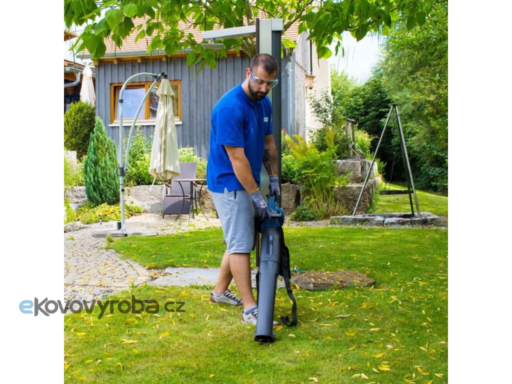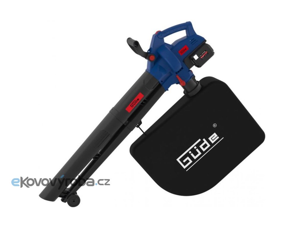 Výkonný akumulátorový vysavač GÜDE, určený k odstranění drobného rostlinného odpadu ze zahradních trávníků i zpevněných ploch okolo domu.