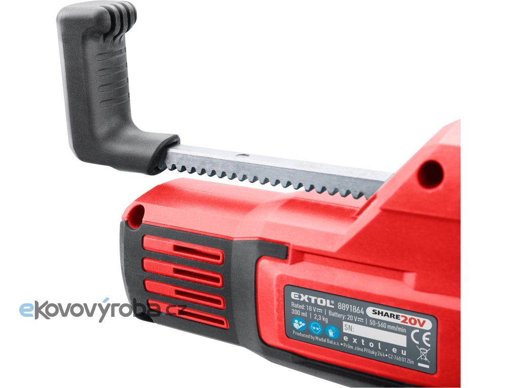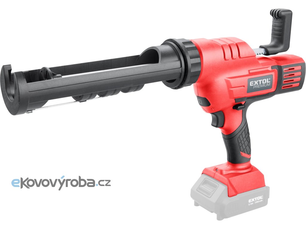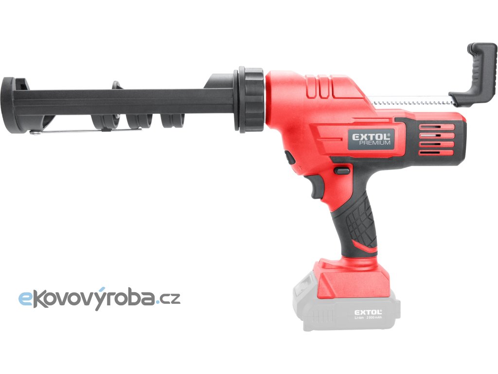 Aku vytlačovací vaničková pistole je určena k vytlačování silikonu, chemických kotev apod. z kartuší. Rychlost posuvu lze nastavit na 6polohovém regulátoru v rozsahu 50-560mm/min, což umožňuje přesnou regulaci toku hmoty. Silný motor a převody vyvinou tlak až 2000N tlačné síly. Pistole má funkci ANTI-DRIP, která po zastavení pistole automaticky popojede nazpátek a díky tomuto uvolnění tlaku v tubě, nepokračuje vytlačování hmoty. Pro zrychlení práce není zpětný chod motorizovaný, ale jen rychle povytáhnete píst. Vaničku je možno otočit v rozsahu 360°. Stroj je vybaven ochrannou proti přetížení. Rukojeť je pokryta měkkou protiskluzovou gumou, která snižuji vibrace a dobře se drží. Přímo nad baterií je umístěno osvětlení, které osvětluje pracovní místo. Pro běžnou práci dostačují jeden nebo dva 2000mAh akumulátory, které můžete rychle nabít v rychlonabíječce, pro náročnější nebo delší práci doporučujeme větší akumulátory s kapacitou 4000–8000mAh. Akumulátor lze použít ve všech typech nářadí řady EXTOL SHARE20V. Díky použité Li-ion technologii je ho možné kdykoliv dobíjet, aniž by se tím snižovala jeho kapacita. Li-ion akumulátor ztrácí energii vlivem samovybíjení velmi pomalu a vydrží dlouho nabitý a připravený k použití.