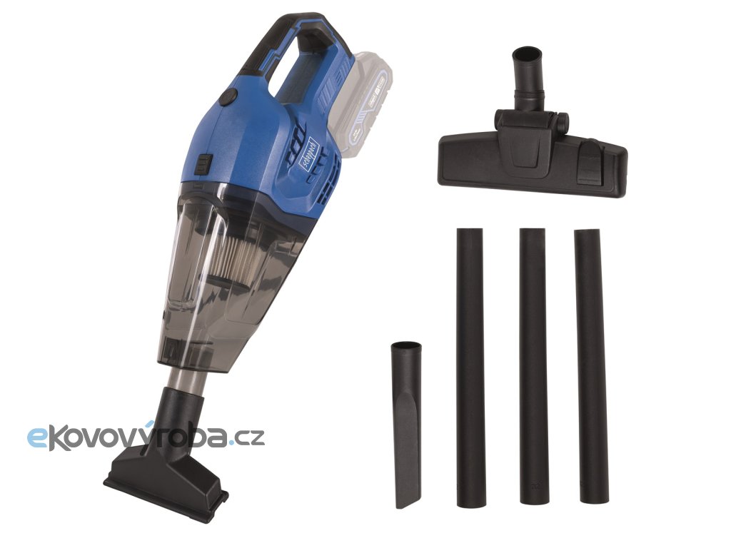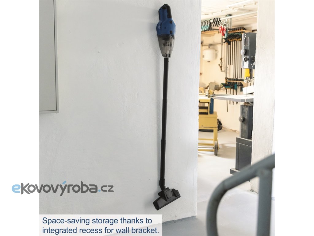Velký zásobník na nečistoty o objemu 560 ml umožňuje delší úklid bez nutnosti častého vyprazdňování. Vysavač je vybaven sadou tří plastových prodlužovacích trubek a podlahovou hubicí, díky čemuž jej lze pohodlně využít i na úklid podlah. Ergonomicky tvarované držadlo s měkkým povrchem zajišťuje komfortní manipulaci, zatímco účinný filtr třídy F9 dokáže zachytit i jemné prachové částice. Filtr je navíc snadno omyvatelný pod tekoucí vodou, což zvyšuje jeho životnost. Stroj se dodává bez baterie a nabíječky.