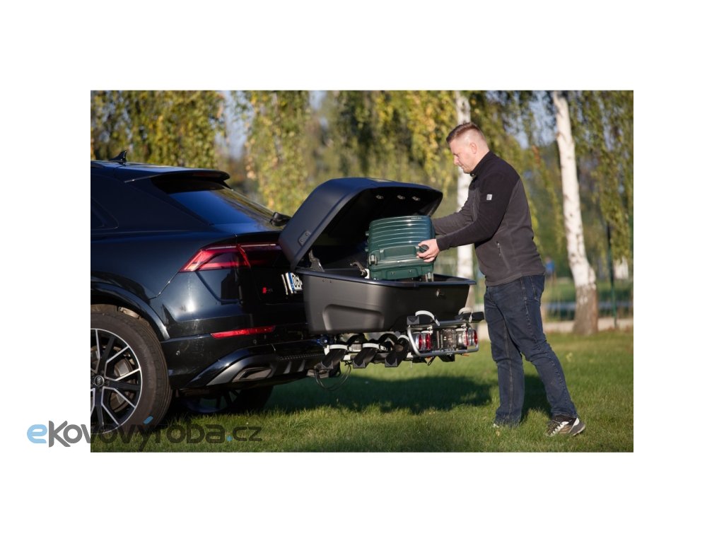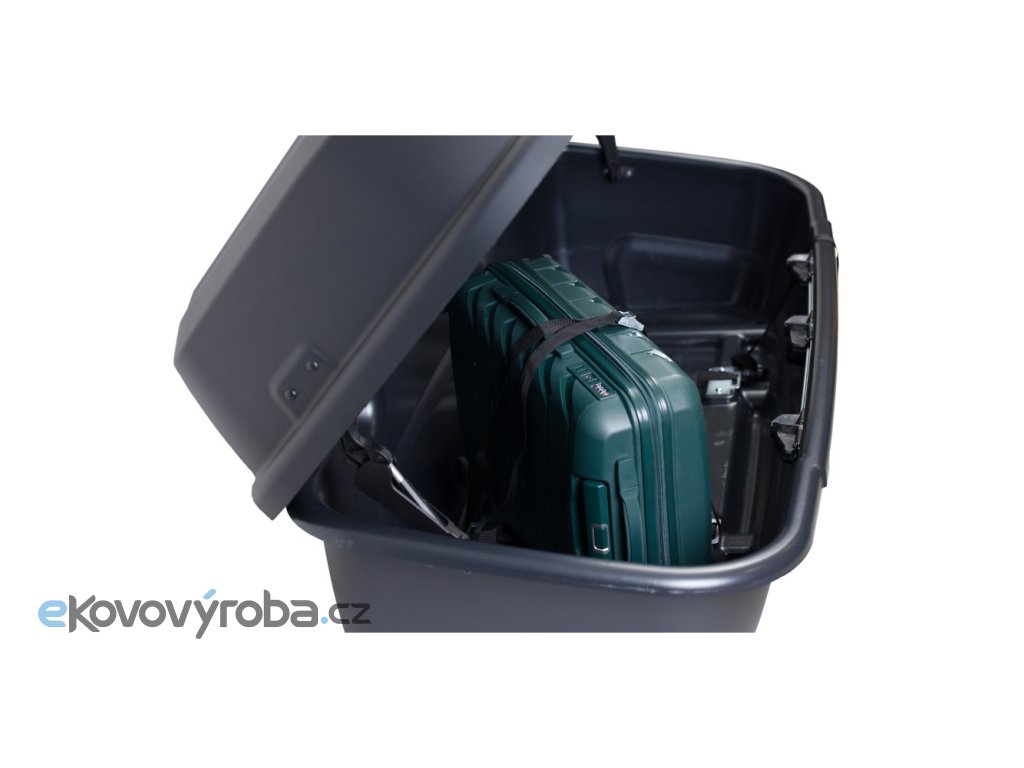 Balení obsahuje box, montážní sadu pro připevnění na nosič kol a popruhy pro upevnění nákladu.
