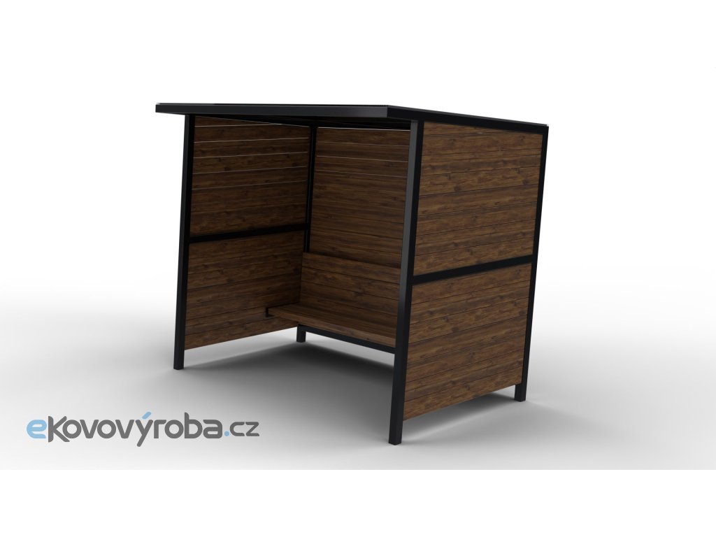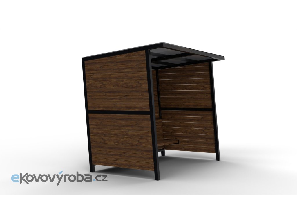 Hranaté oplechování střechy ukrývá spád střechy do zadní částí přístřešku. Všechny ocelové prvky střechy jsou žárově zinkované s barevnou povrchovou úpravou podle RAL vzorníku.