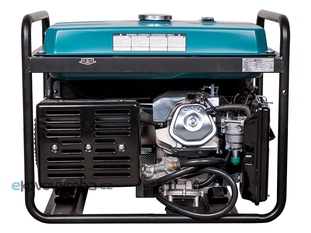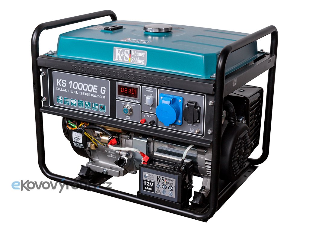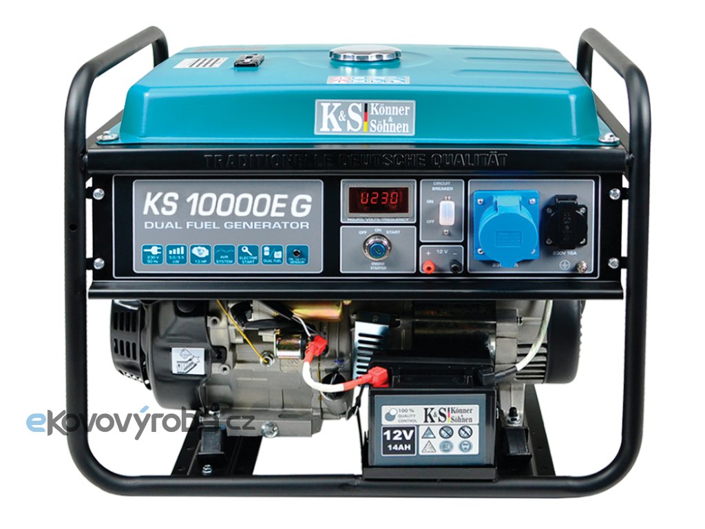 Elektrocentrála KS 10000E G řady DUAL FUEL pracuje jak na benzín, tak na zkapalněný plyn (propan-butan). Díky své účinnosti je tak šetrná k životnímu prostředí a pohon na plyn zvyšuje životnost motoru. Výkonný jednoválcový vzduchem chlazený čtyřtaktní motor K&S zajišťuje stabilní a spolehlivý provoz elektrocentrály.