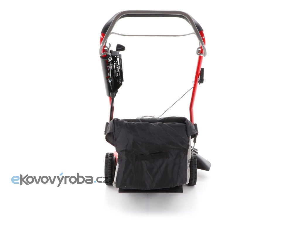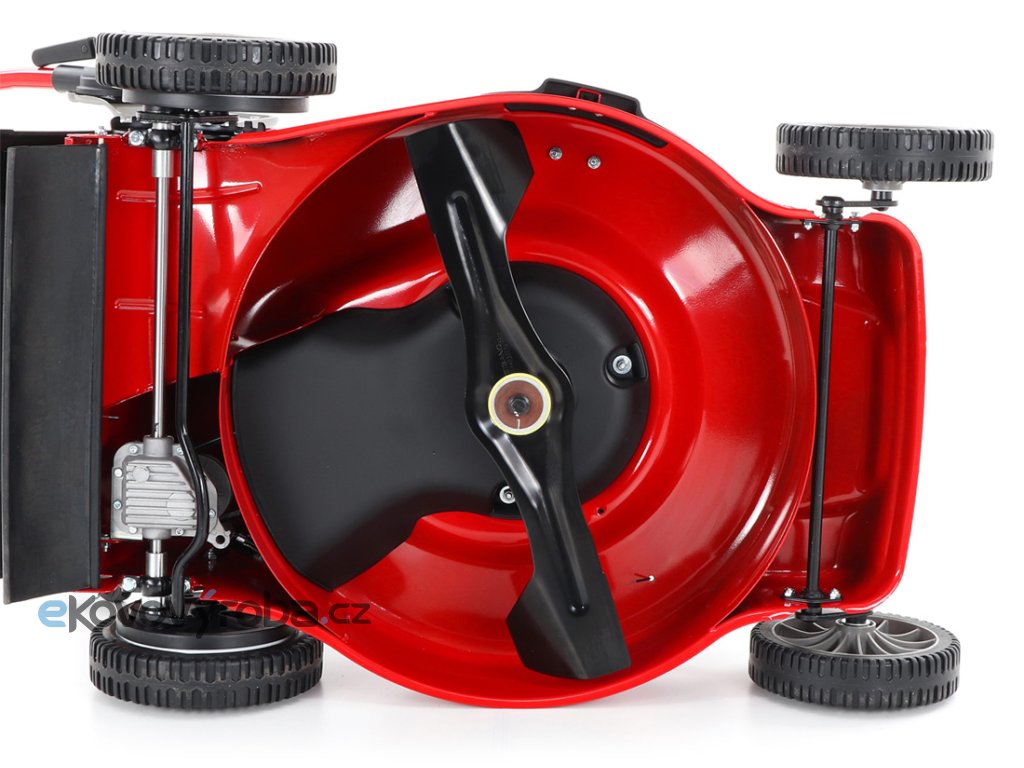 zadním deflektorem a má variabilní pojezd daný 3 rychlostní variátorovou převodovkou. Výhoda hodně silného motoru o výkonu 7 HP a nože s velkými lopatami Vám perfektně sebere i přerostlou mokrou trávu. Pogumovaná sendvičová kola jsou uložena v oboustranných kuličkových ložiscích,