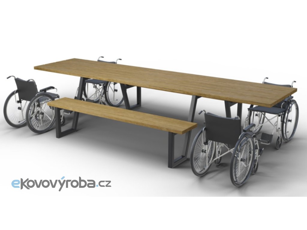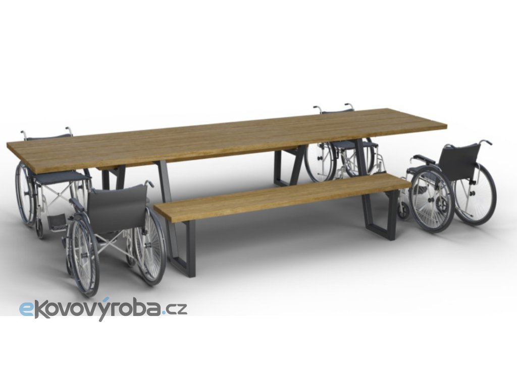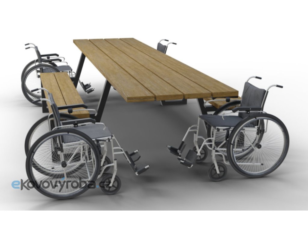 Tento model inkluzivního setu je navržen tak, aby umožňoval pohodlné sezení osobám na invalidním vozíku i osobám na běžných lavičkách u jednoho stolu. Konstrukce je vyrobena z odolného ocelového rámu s práškovou povrchovou úpravou a dřevěnými prkny odolnými proti povětrnostním vlivům. Sedací desky jsou vybaveny ocelovými výztužemi proti prohýbání, čímž je zajištěna stabilita a dlouhá životnost. Prodloužený stůl je také vyztužen proti prohýbání.