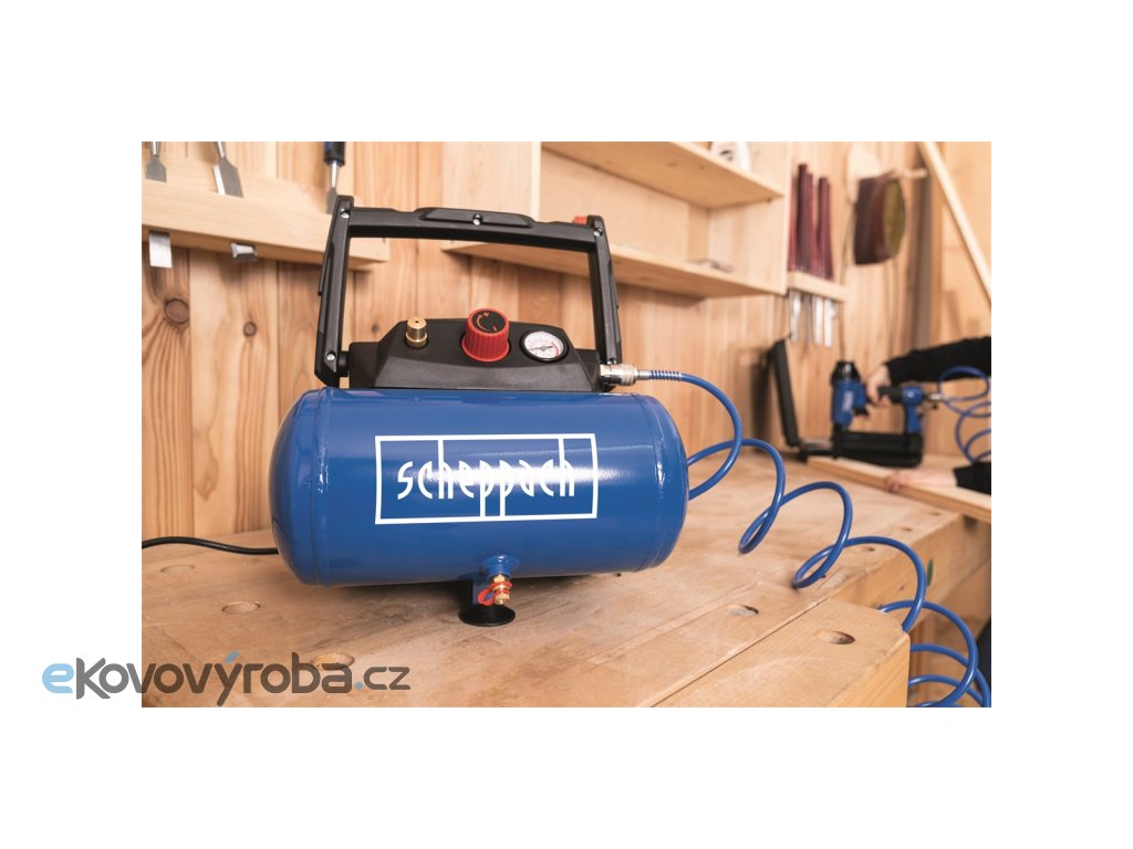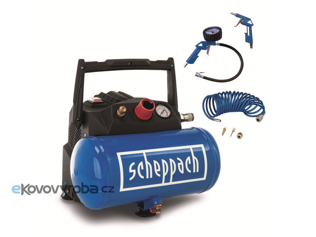 Kompresor Scheppach HC 06 je praktický, lehký a snadno přenosný kompresor s tlakovou nádobou o objemu 6 l a silným motorem 1200 W. Díky moderní bezolejové technologii má minimální nároky na údržbu. Hodí se jak do běžných domácích dílen, tak i pro řemeslníky, pro které je důležitým kritériem nízká váha, malá hmotnost a snadný transport. Díky vzdušníku se kompresor hodí nejenom na běžné nafukování pneumatik, míčů, matrací, jízdních kol, ale můžete k němu připojit i sponkovačku, stříkací pistoli (air brush), ofukovací pistoli apod. Díky bezolejové technologii je vhodný i na tlakování výčepních zařízení. Výši tlaku si jednoduše nastavíte otočným ovladačem a jednoduše kontrolujete pomocí vestavěného manometru. Stroj je vybaven velkým madlem, háky pro snadné namotání přípojného kabelu a pro dobrou stabilitu i nohami s gumovými patkami. Kompresor je už v základu vybaven bohatou sadou šestidílného příslušenství, takže ho můžete bez dalších finančních výdajů začít ihned používat. Nástroje šestidílné sady jsou vyrobeny z kvalitních slitin kovů a snadno se připojí na rychlospojku kompresoru.