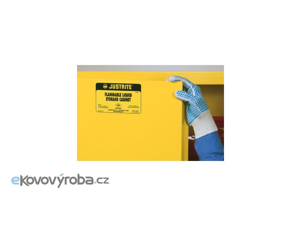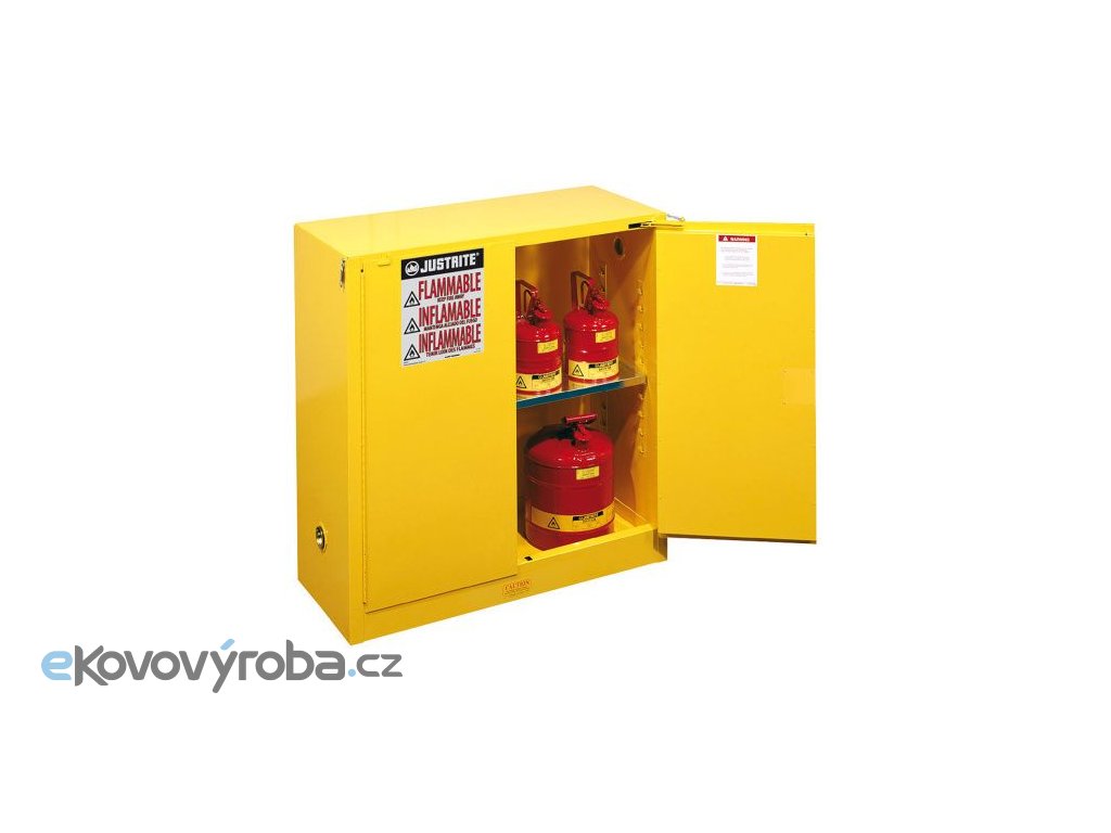 Vyrobeno z vysoce kvalitní a vysoce odolné oceli – tloušťka pláště je 1 mm. Vybaveno tzv. piano pantem, jež zajišťuje pevné zavěšení dveří – v případě požáru redukuje přístup vzduchu. Tříbodový systém rozvorného zámku z nerezové oceli výrazně zvyšuje stupeň zabezpečení. Vybaveno reflexními nálepkami upozorňujícími na skladování nebezpečných látek ve třech jazycích. Vybaveno přestavitelnými policemi po 76 mm a jsou vyrobeny z pozinkované oceli s nosností 159 kg. Police umožňuje odvod kapalin do nerozpustné záchytné vany na dně skříně. Patentovaný systém – U.LOC TM – zapuštěný zámek, který je možné doplnit visacím zámkem (není součástí). Vybaveno dvěma odvětracími otvory s proti-zážehovou pojistkou – u podlahy a u stropu skříně. stability a bezpečnosti. Dvouplášťová konstrukce s izolační mezerou 38 mm. Na zadní straně je umístěn konektor pro uzemnění skříně. Certifikováno dle norem FM (požární ochrana látek 10 minut), OSHA a NFPA Kód 30 sekce 6.3.3. Záruční doba stanovena na 10 let.