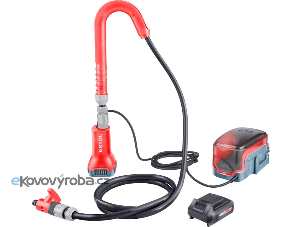 Aku čerpadlo do sudu je určeno pro čerpání čisté vody ze sudů s dešťovou vodou a díky své výtlačné výšce 21m dostane vodu na celou plochu domácí zahrady i v případě, že má vysoké převýšení. Se sudovým čerpadlem odpadá nošení těžkých konví s vodou pro zalévání na zahradní hadici lze totiž připojit různá zavlažovací a kropící/ zalévací příslušenství a s použitím kropítka na tyči lze komfortně zalévat květiny v květináčích ve výšce, rosit květiny mlhou nebo s použitím kropícího příslušenství pro zalévání trávníku lze tak k zalévání trávníku použít dešťovou vodu. Aku verze navíc umožňuje používat čerpadlo v místech kde není přístup k elektrické energii. Čerpadlem projdou pevné nečistoty o maximální velikosti 0,5mm. Na výstupu čerpadla je flexibilní hadice s ventilem, kterým lze upravit průtok vody dle potřeby a běžná rychlospojka na kterou si můžete jednoduše připojit co potřebujete. Pro zjednodušení obsluhy má čerpadlo na výstupu hadici s hákem a lze ho zavěsit do sudu. Čerpadlo je určeno k čerpání čisté užitkové vody bez obsahu jakéhokoli mechanického znečištění. Baterie je uložena ve vodovzdorném krytu s hákem pro zavěšení. Pro běžnou práci dostačují jeden nebo dva 2Ah akumulátory, které můžete rychle nabít v rychlonabíječce, pro náročnější nebo delší práci doporučujeme větší akumulátory s kapacitou 4–8Ah. Akumulátor lze použít ve všech typech nářadí řady EXTOL SHARE20V. Díky použité Li-ion technologii je ho možné kdykoliv dobíjet, aniž by se tím snižovala jeho kapacita. Li-ion akumulátor ztrácí energii vlivem samovybíjení velmi pomalu a vydrží dlouho nabitý a připravený k použití.