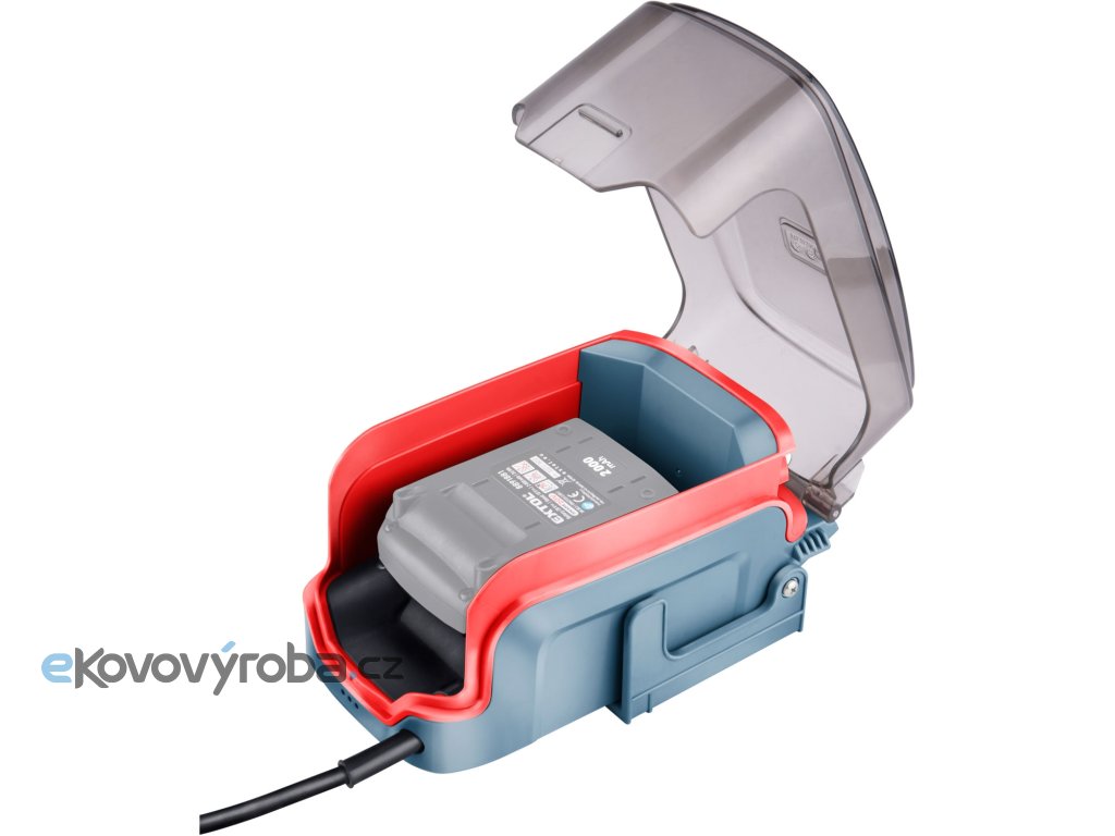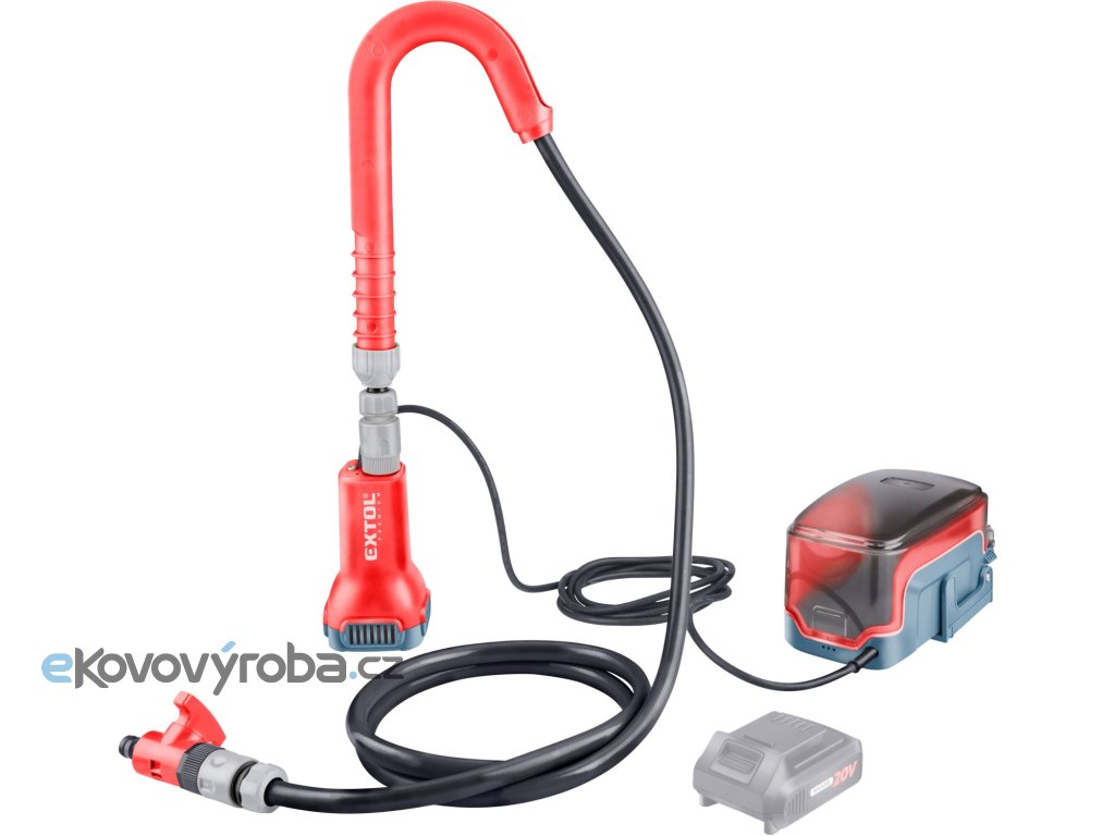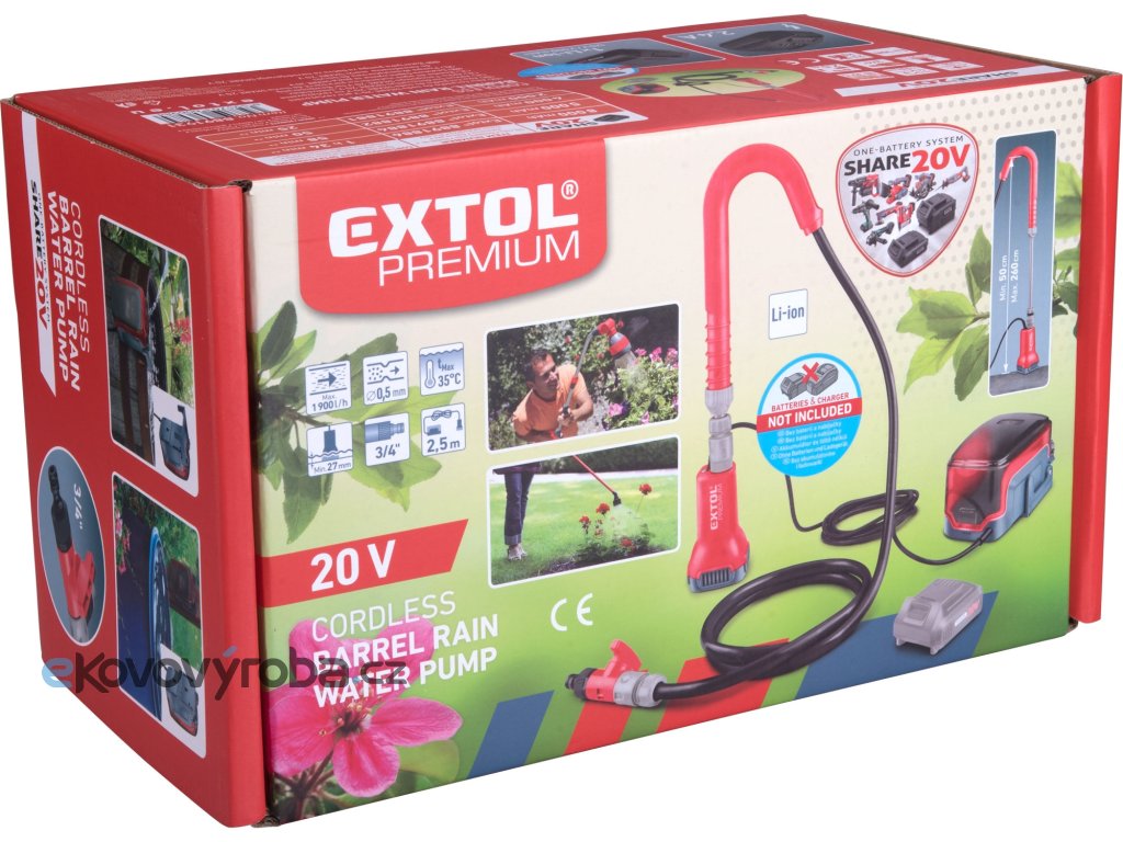 Aku čerpadlo do sudu je určeno pro čerpání čisté vody ze sudů s dešťovou vodou a díky své výtlačné výšce 21m dostane vodu na celou plochu domácí zahrady i v případě, že má vysoké převýšení. Se sudovým čerpadlem odpadá nošení těžkých konví s vodou pro zalévání na zahradní hadici lze totiž připojit různá zavlažovací a kropící/ zalévací příslušenství a s použitím kropítka na tyči lze komfortně zalévat květiny v květináčích ve výšce, rosit květiny mlhou nebo s použitím kropícího příslušenství pro zalévání trávníku lze tak k zalévání trávníku použít dešťovou vodu. Aku verze navíc umožňuje používat čerpadlo v místech kde není přístup k elektrické energii. Čerpadlem projdou pevné nečistoty o maximální velikosti 0,5mm. Na výstupu čerpadla je flexibilní hadice s ventilem, kterým lze upravit průtok vody dle potřeby a běžná rychlospojka na kterou si můžete jednoduše připojit co potřebujete. Pro zjednodušení obsluhy má čerpadlo na výstupu hadici s hákem a lze ho zavěsit do sudu. Čerpadlo je určeno k čerpání čisté užitkové vody bez obsahu jakéhokoli mechanického znečištění. Baterie je uložena ve vodovzdorném krytu s hákem pro zavěšení. Pro běžnou práci dostačují jeden nebo dva 2Ah akumulátory, které můžete rychle nabít v rychlonabíječce, pro náročnější nebo delší práci doporučujeme větší akumulátory s kapacitou 4–8Ah. Akumulátor lze použít ve všech typech nářadí řady EXTOL SHARE20V. Díky použité Li-ion technologii je ho možné kdykoliv dobíjet, aniž by se tím snižovala jeho kapacita. Li-ion akumulátor ztrácí energii vlivem samovybíjení velmi pomalu a vydrží dlouho nabitý a připravený k použití.