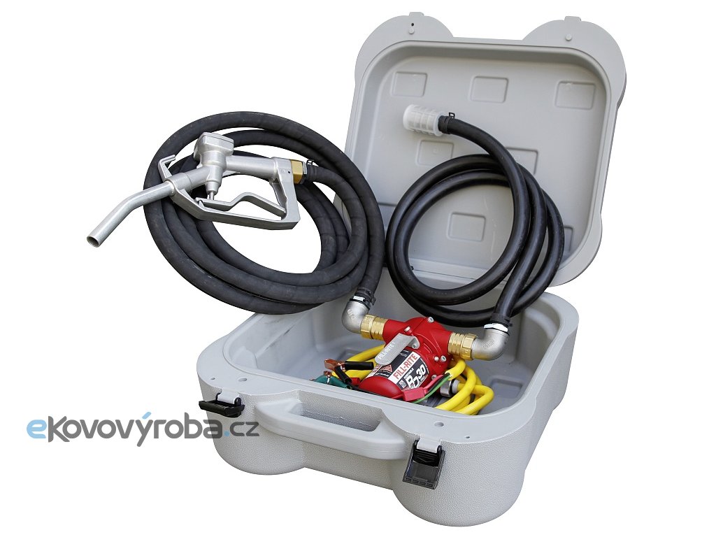 Čerpací souprava na benzín v kufříku. Obsahuje čerpadlo na benzín 12V s ATEX, výdejní hadici 4 metry s manuální pistolí, napájecí kabel délky 4,1 metru, plastový kufřík s madlem.