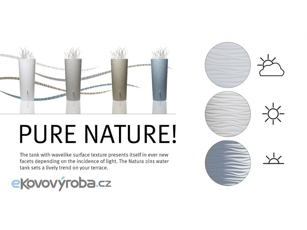 Nádoby na vodu jsou vyrobeny z polyethylenu a jsou recyklovatné. Jsou odolné proti veškerým vlivům počasí - UV záření, mráz...