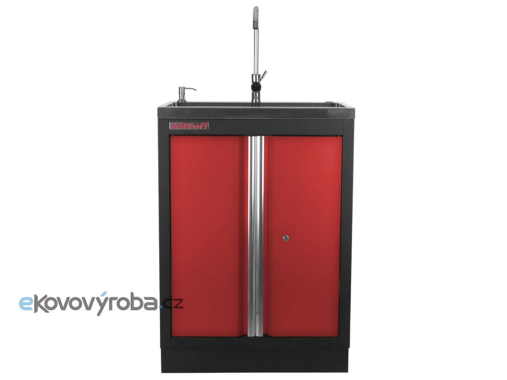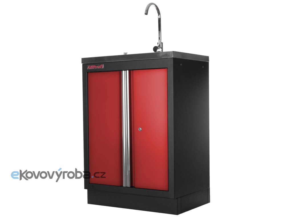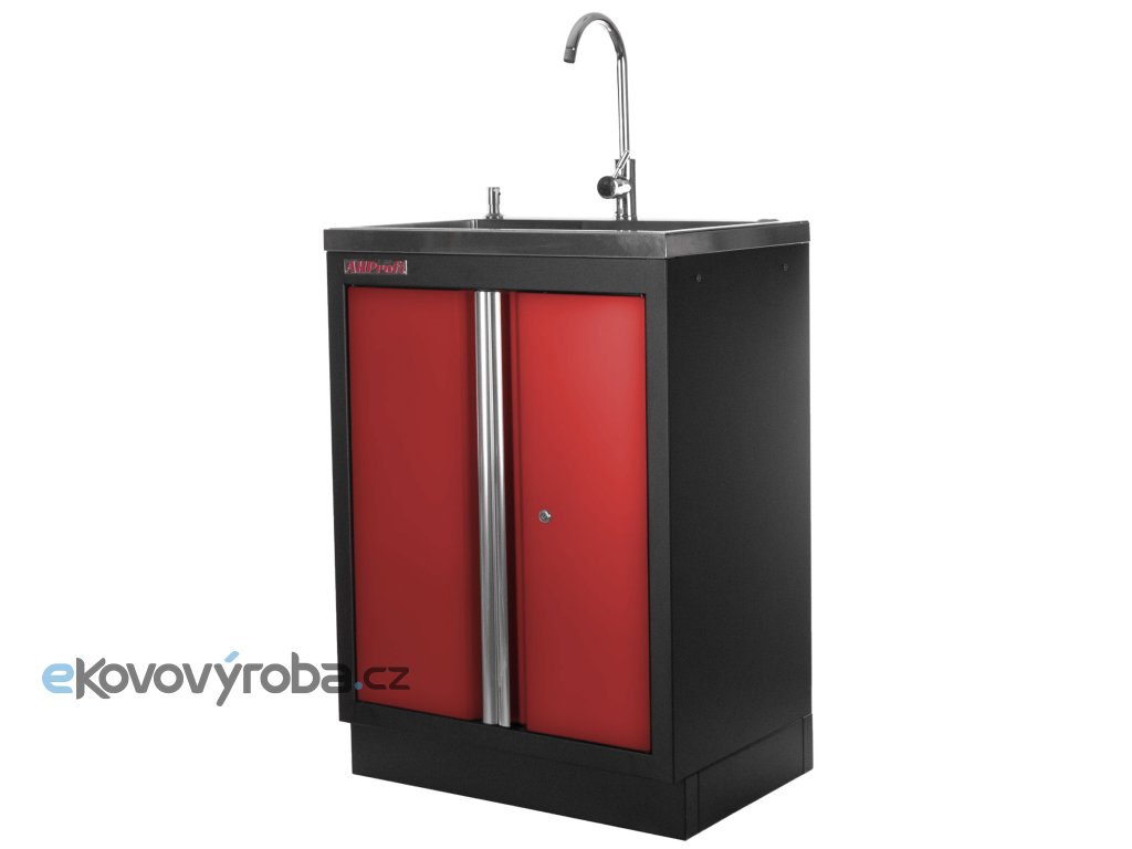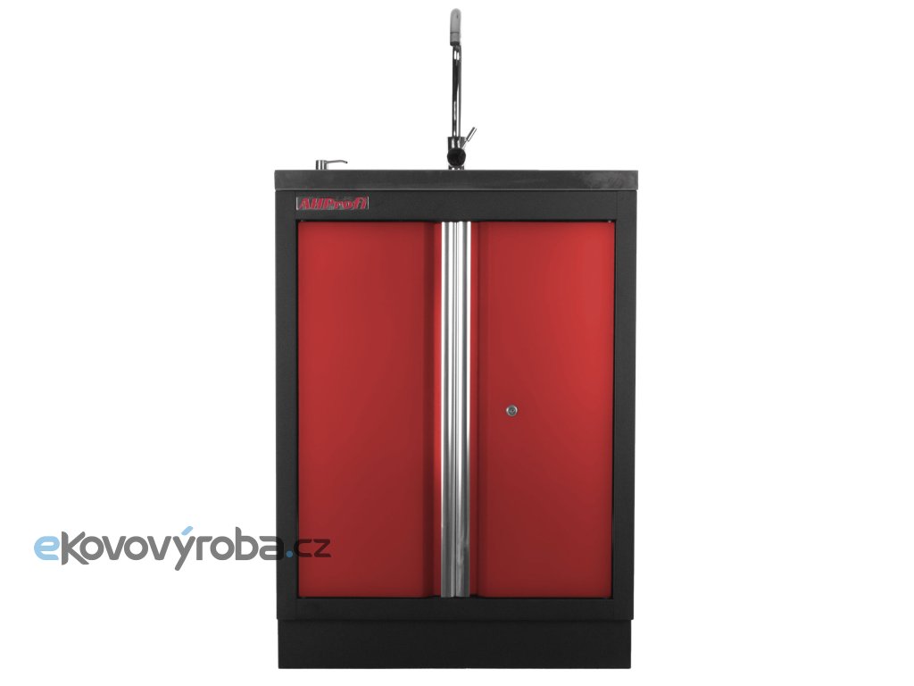Celokovová PROFI RED dílenská dvoukřídlá skříňka s vestavěným nerezovým dřezem a baterií.
