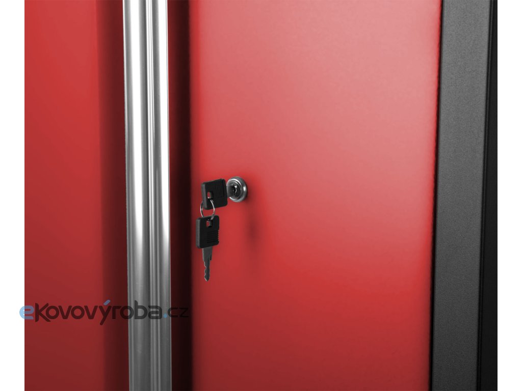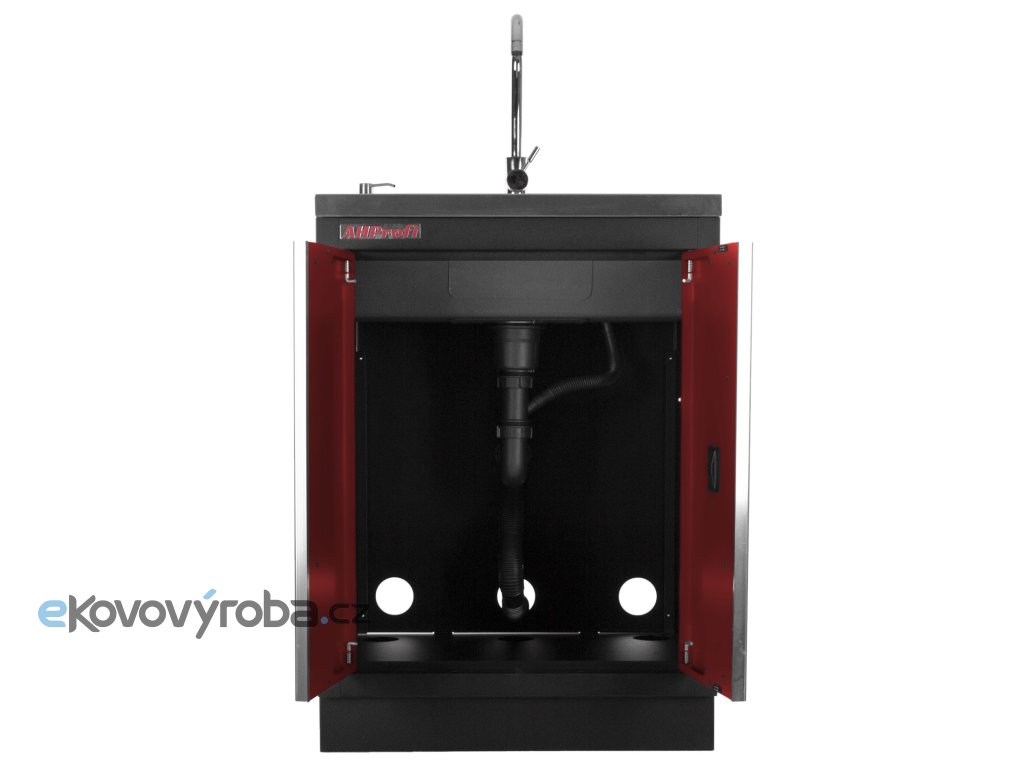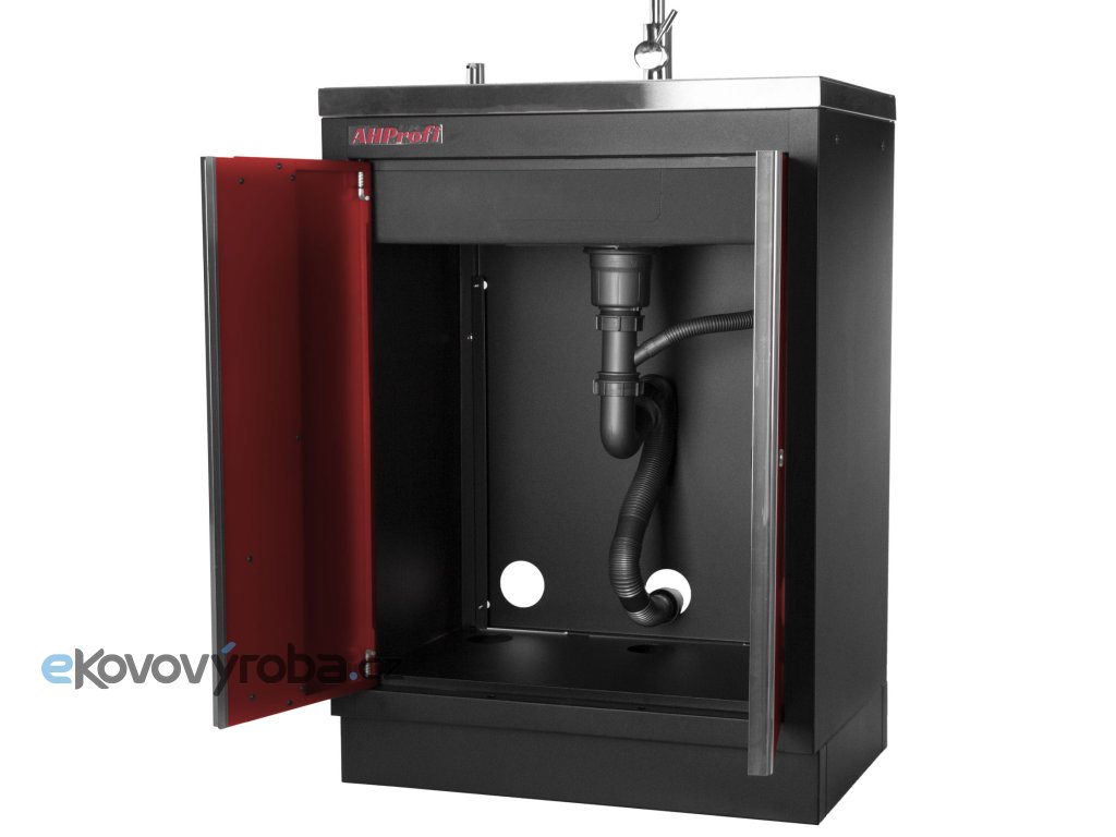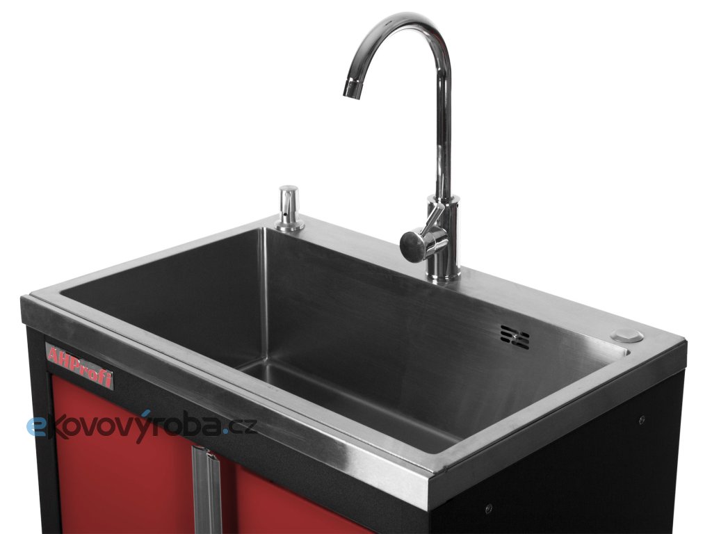Celokovová PROFI RED dílenská dvoukřídlá skříňka s vestavěným nerezovým dřezem a baterií.