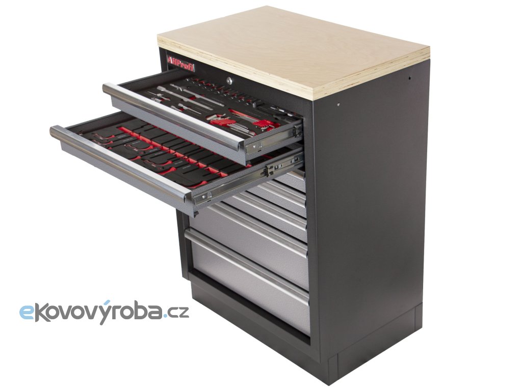 Celokovová PROFI dílenská skříňka s 7-mi zásuvkami. Prodává se i v rámci kvalitní PROFI 10ks sestavy dílenského nábytku TGS1300 nebo menších sestavách. Skříňka je vhodná do profesionálních servisů, dílen, ale také do garáží pro uskladnění širokého sortimentu zboží i ručního nářadí, na které se pak nepráší a snáze se udrží přehledně uklizené na správném místě.
