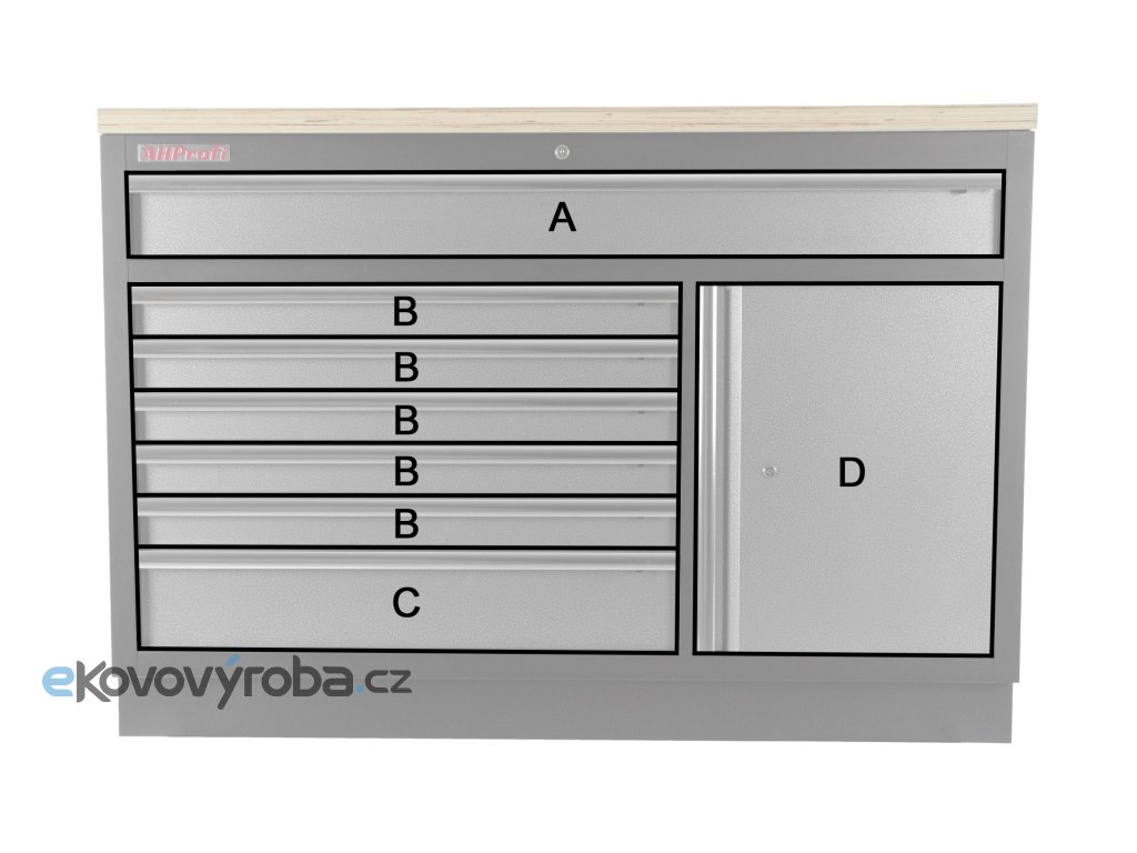 Na levé straně je celkem 6 zásuvek, které se hodí zejména pro ruční nářadí nebo výplně s nářadím, do spodní hlubší zásuvky lze uskladnit i větší nářadí.