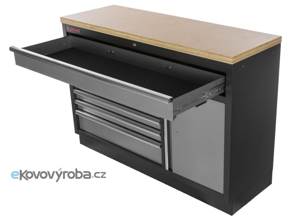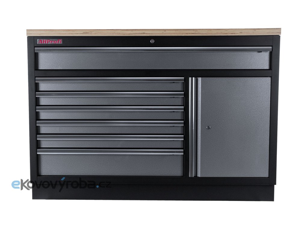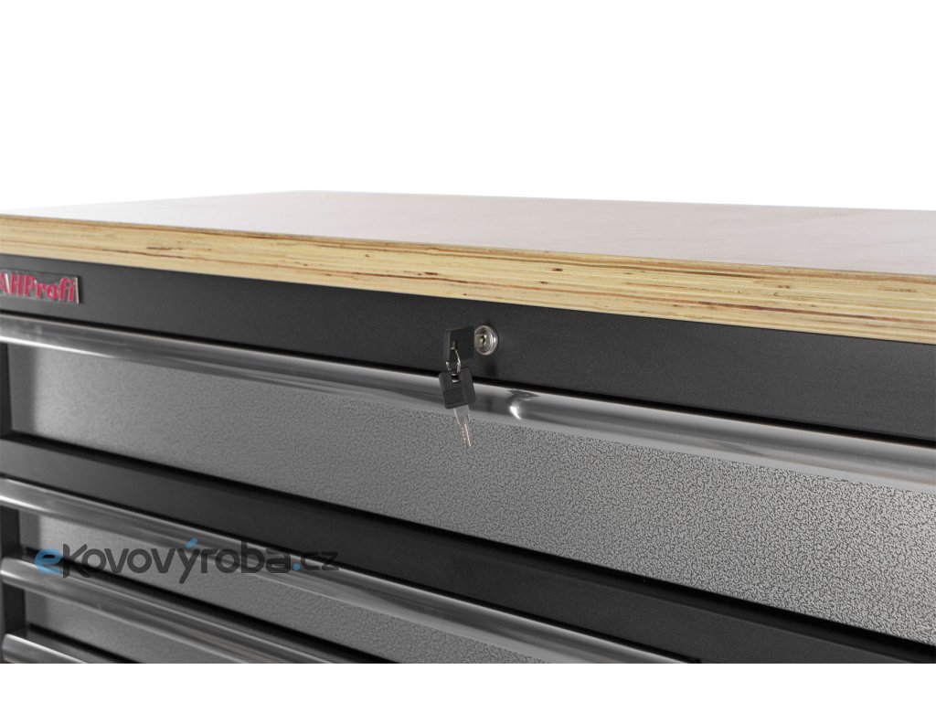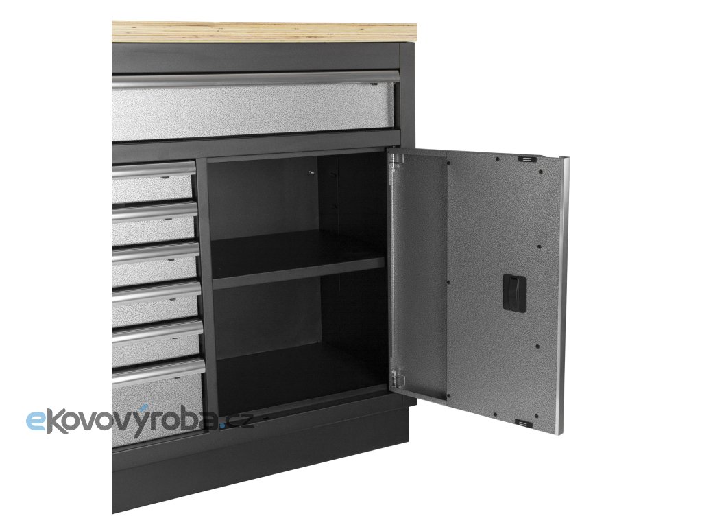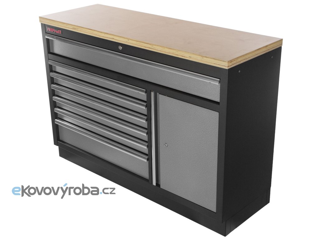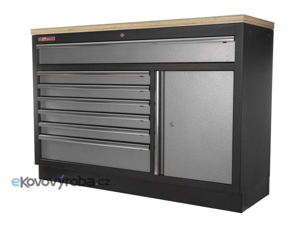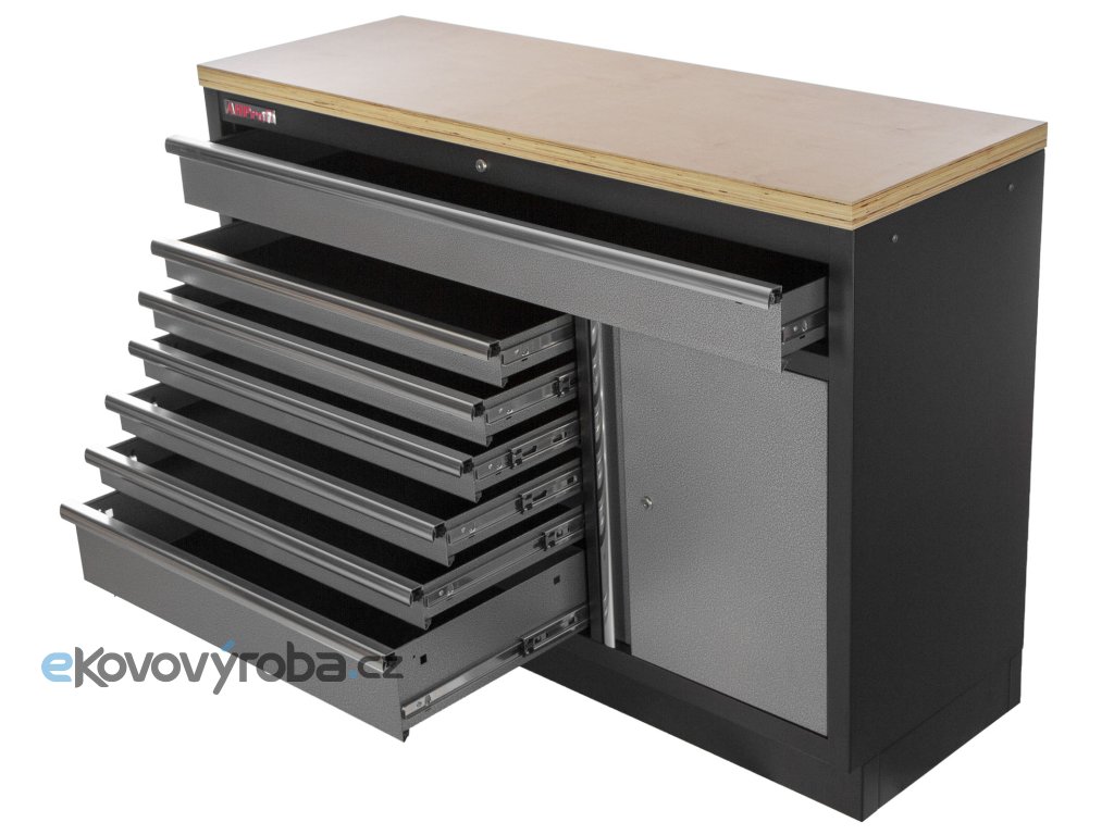 Široká celokovová dílenská skříňka se 7 zásuvkami, skříňkou a dřevěnou pracovní deskou.