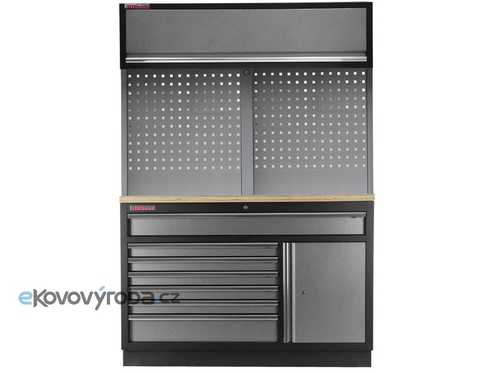 Spodní široká celokovová dílenská skříňka se 7 zásuvkami, skříňkou a dřevěnou pracovní deskou.