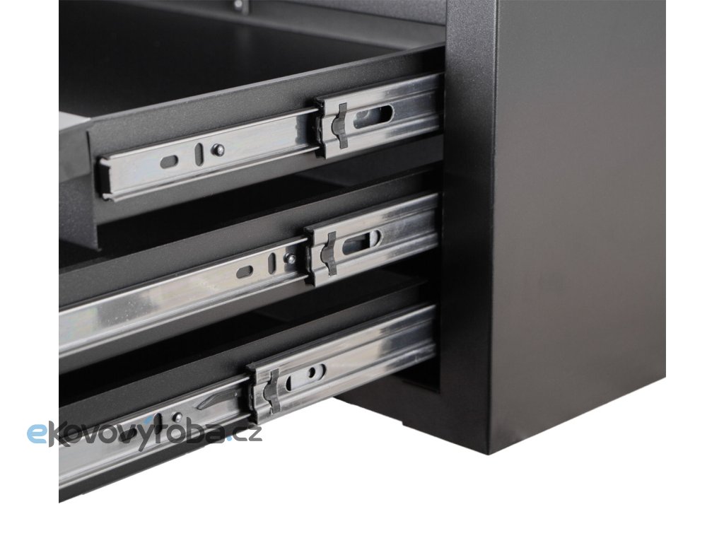 - 5 uzamykatelných zásuvek na vodicích lištách s kuličkovými pojezdy.