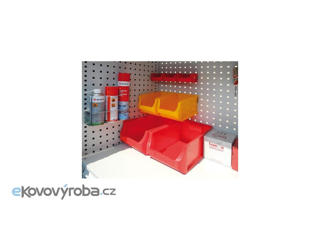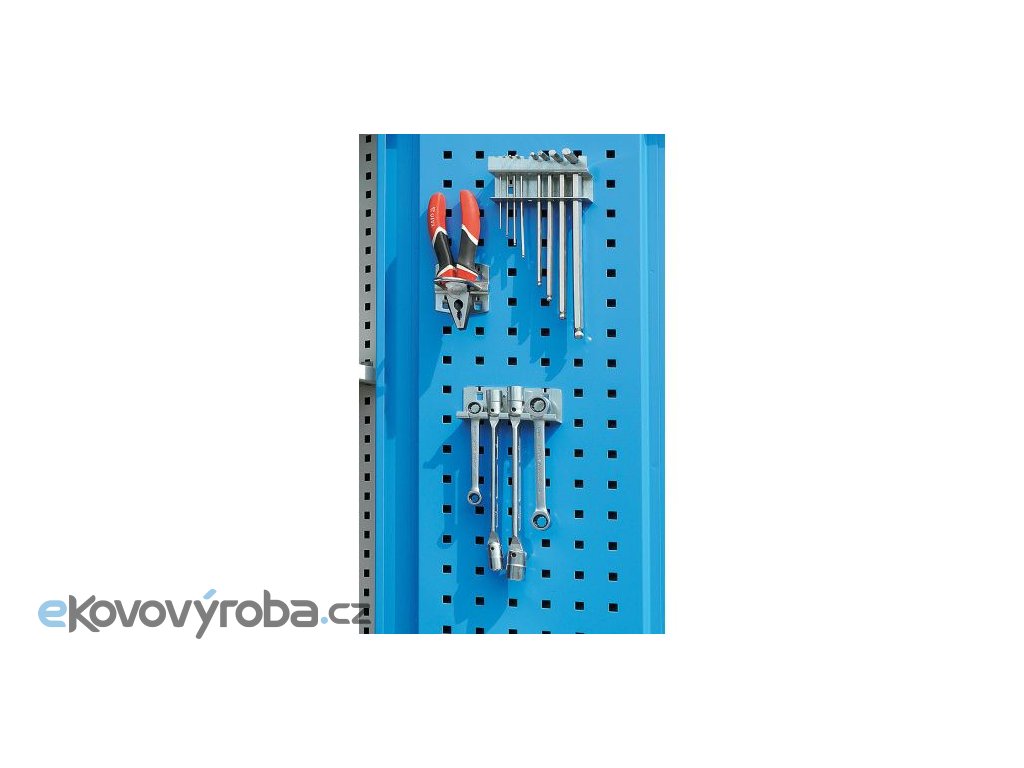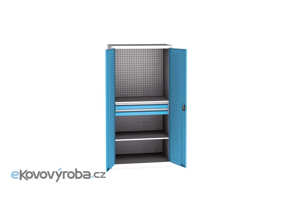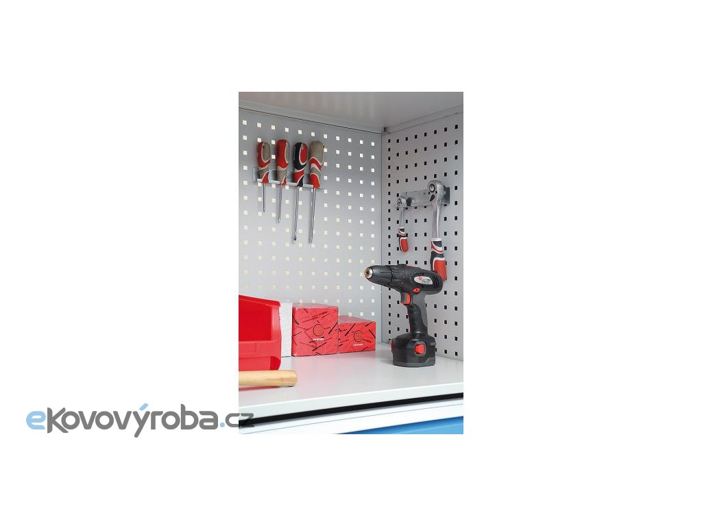 Vyrobeno z ocelového plechu. Součástí perfo výbavy nejsou držáky ani nářadí. Police jsou přestavitelné po 25 mm. Zásuvky disponují výsuvem 80%. Vybaveno cylindrickým rozvorným zámkem. Čela zásuvek jsou upravena pro vložení popisovací lišty. Povrchová úprava provedena kvalitní práškovou barvou.