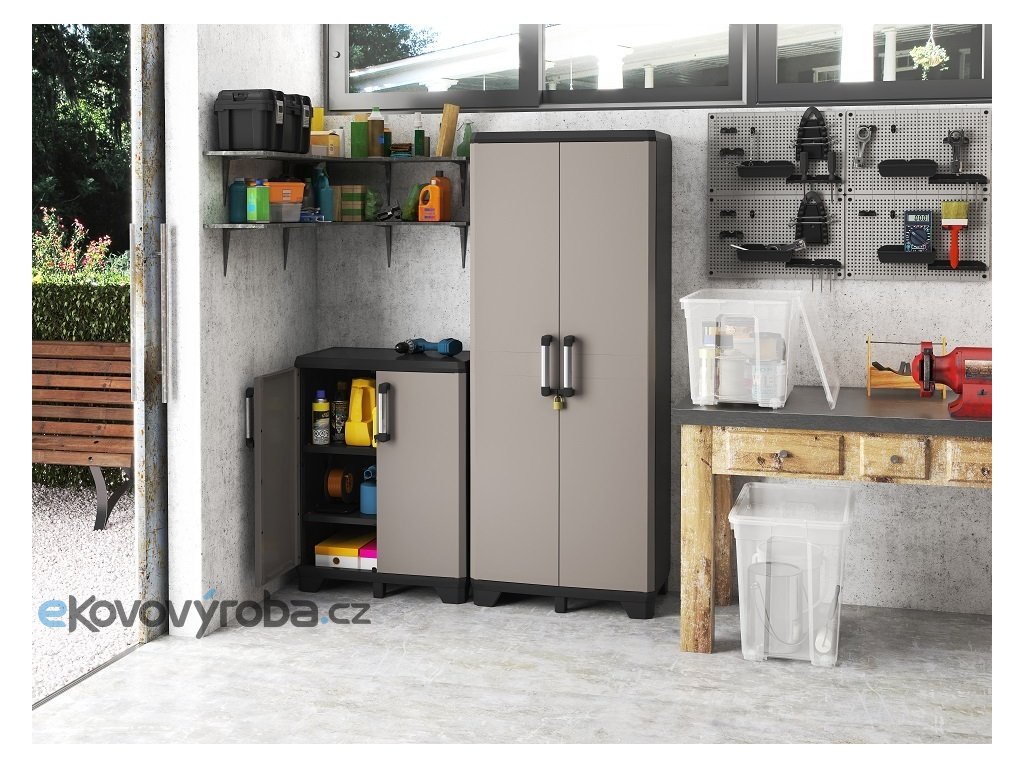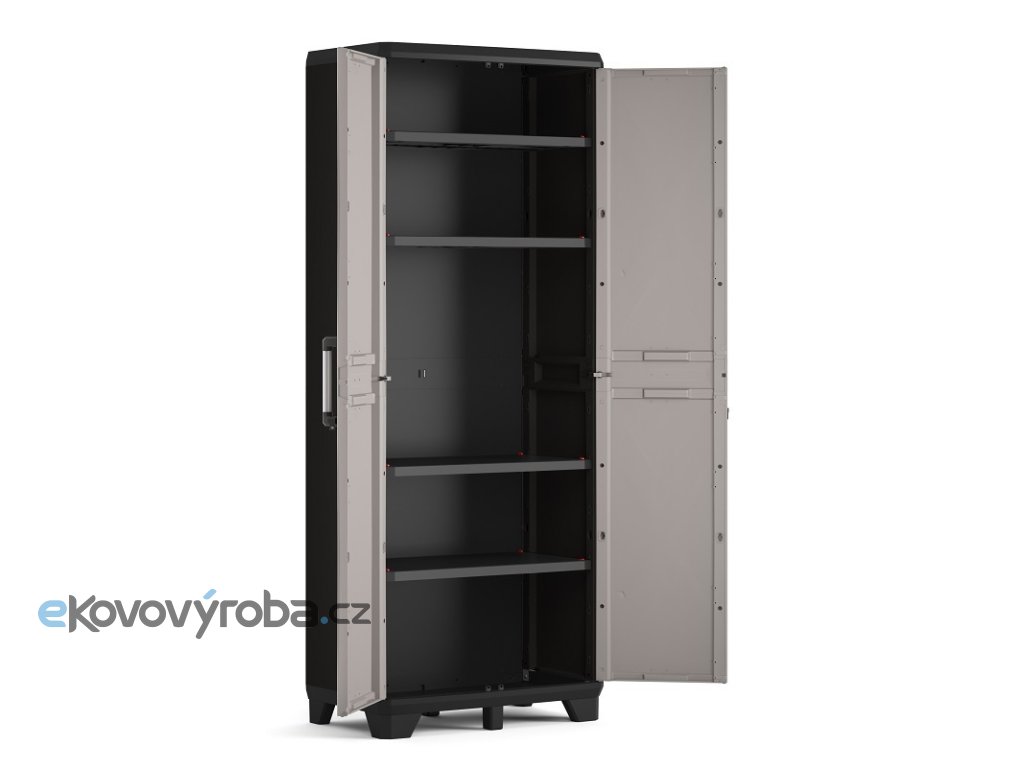 Odolná skříň vhodná do garáže, na chatu, na terasu nebo do sklepa. Pevné panty, možnost uzamčení a odolnost skříně jsou výhodou. Snadná údržba. Čtyři nastavitelné police s nosností 20 kg. - vysoká skříň- čtyři nastavitelné police- nosnost polic 20 kg- velká odolnost