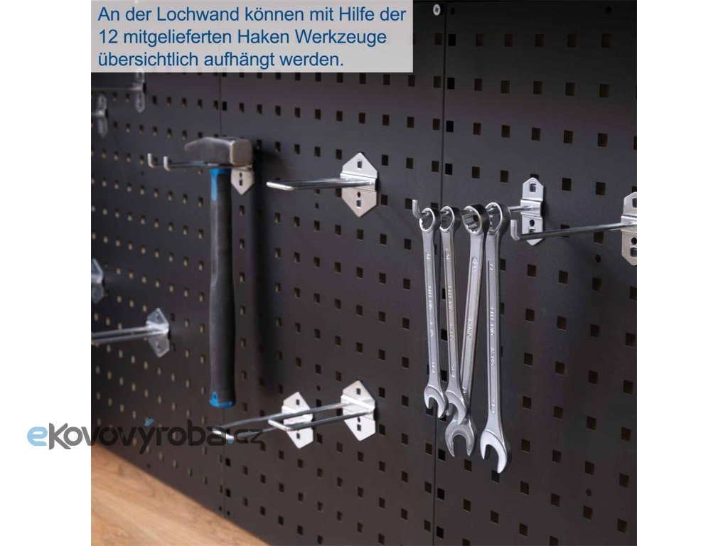 Modulární dílenský systém Scheppach GWS 08 je ideálním řešením pro každou dílnu, a to i s omezeným prostorem. Obsahuje základní vybavení, které vám pomůže efektivně zorganizovat pracovní prostředí a mít vše potřebné po ruce. Sada zahrnuje jednu skříň, závěsnou skříň, pracovní stůl, dva pojízdné dílenské vozíky, perforovanou stěnu a dvanáct háků, díky kterým bude vaše dílna perfektně uspořádaná. Všechny prvky jsou vyrobeny z robustního, práškově lakovaného ocelového plechu, takže jsou odolné a mají dlouhou životnost. Skříně jsou uzamykatelné, což umožňuje bezpečné uložení pracovního vybavení a nástrojů. Samostatná skříň je vybavena křídlovými dveřmi, nastavitelnými policemi s nosností 30 kg na polici a výškově stavitelnými nožičkami pro lepší stabilitu i na nerovných podlahách. Závěsná skříň má uzamykatelné dveře na obou stranách a otevřenou střední část se třemi policemi, které unesou celkem 50 kg. V zadní části má perforovanou stěnu s normovaným otvorem 10 x 10 mm a roztečí 38 mm, což umožňuje snadné připevnění háků a dalších doplňků. Součástí balení je také dvanáct háků pro různé nástroje – šest jednoduchých háků, tři dvojité a tři uzavřené dvojité háky. Dva dílenské vozíky se postarají o mobilitu a flexibilitu v organizaci nářadí. Jeden vozík nabízí čtyři uzamykatelné zásuvky, zatímco druhý je vybaven jednou zásuvkou a dvěma uzamykatelnými skříňkami. Oba vozíky jsou na čtyřech kolečkách, z nichž dvě lze zabrzdit. Nosnost každé zásuvky činí 10 kg. Pracovní stůl s pevnou pracovní deskou o rozměrech 1600 x 500 mm poskytuje velkorysou pracovní plochu. Výškově nastavitelné nohy zajišťují stabilitu na jakémkoliv povrchu. Systém doplňuje perforovaná stěna s normovanými otvory 10 x 10 mm a roztečí 38 mm, což umožňuje variabilní uspořádání nářadí a pomůcek. Tento dílenský modulový systém kombinuje funkčnost, kvalitu a flexibilitu, a je proto ideálním řešením pro každého, kdo chce mít v dílně pořádek a pracovat efektivně.
