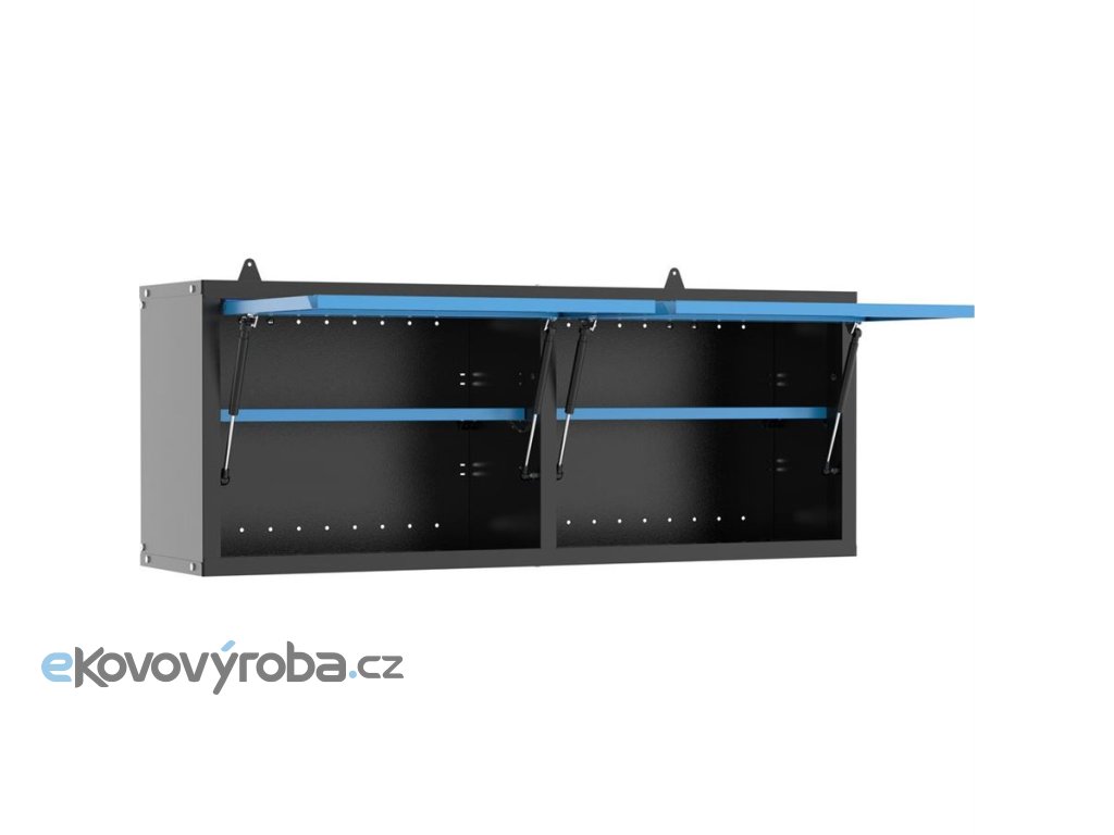 Konstrukce: korpus z ocelového plechu, úchyty pro montáž na stěnu (2), barevné provedení: RAL 9005 (rám, police), RAL 5015 (dvířka).