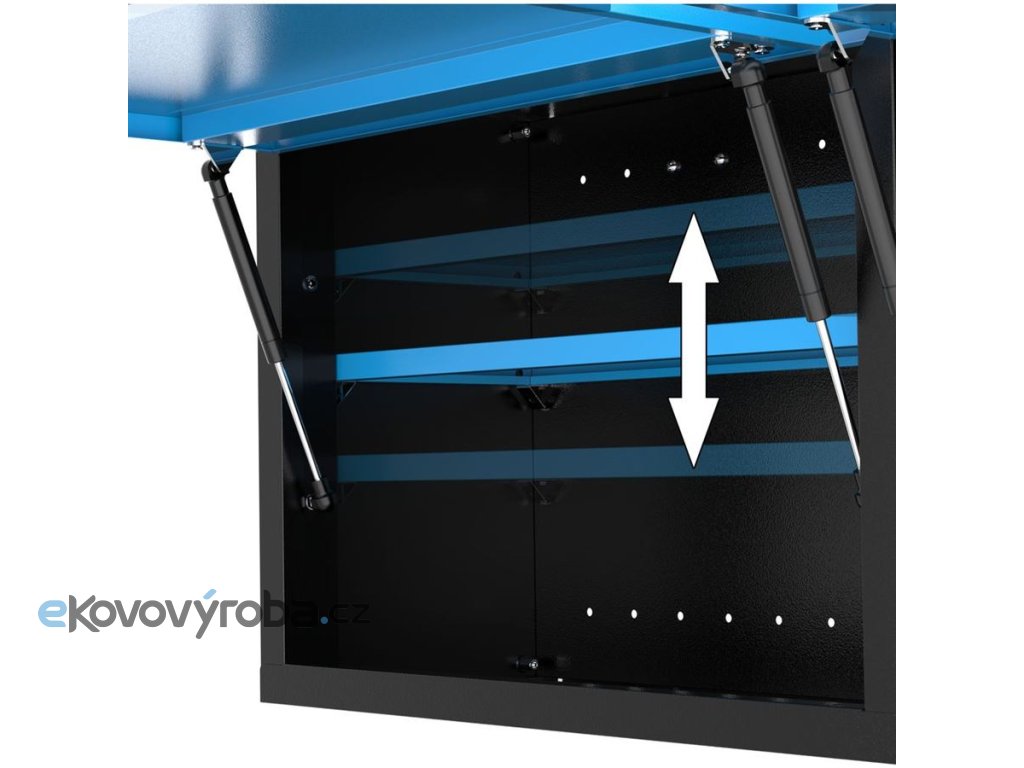 Vybavení: 2 ukládací police (-> max. nosnost: 15 kg; s 3 - polohovým nastavením výšky), výklopná dvířka s teleskopickými vzpěrami (4).