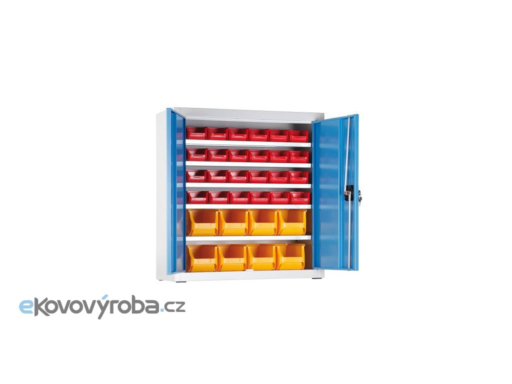 Vyrobeno z ocelového plechu. Vybaveno přestavitelnými policemi z pozinkovaného plechu. Nosnost police 60 kg, přestavitelné po 25 mm. Povrchová úprava provedena práškovou barvou. Zesílené křídlové dveře jsou vybaveny cylindrickým rozvorným zámkem. Skříně jsou kalkulovány včetně zásobníků. Zásobník (ŠxDxV) - (B) 150x235x125, (C) 102x215x75, (D) 102x100x60 mm. Obsahuje tyto zásobníky4638-6 → 24 ks6718-4 → 8 ks