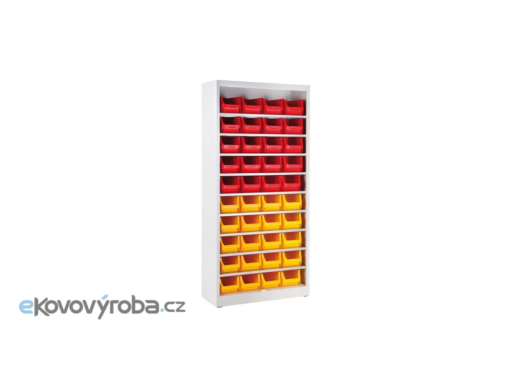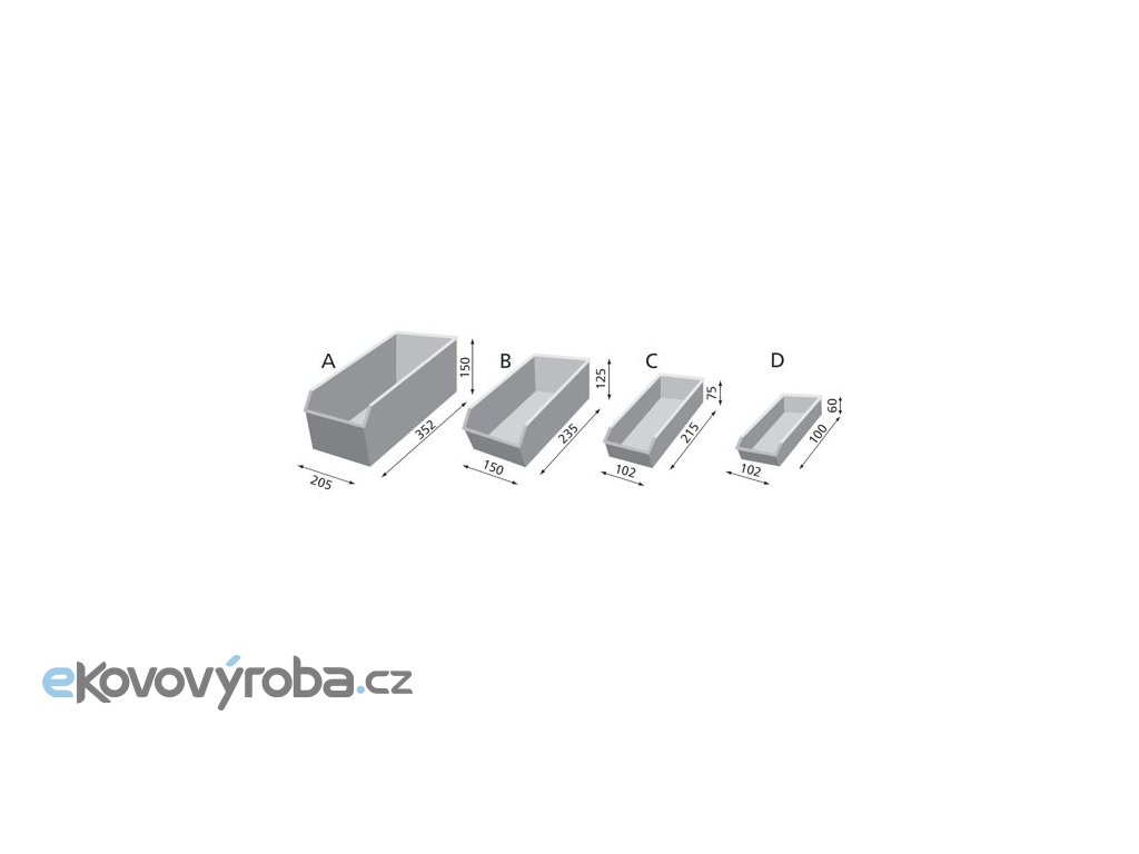 Vyrobeno z ocelového plechu. Vybaveno přestavitelnými policemi z pozinkovaného plechu. Nosnost police 60 kg, přestavitelné po 25 mm. Povrchová úprava provedena práškovou barvou. Skříně jsou kalkulovány včetně zásobníků. Zásobník (ŠxDxV) - (A) 205x352x150, (B) 150x235x125, (C) 102x215x75.