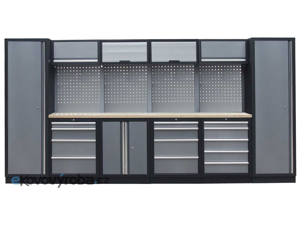 Dílenský nábytek PROFI GREY s dřevěnou deskou zaujme moderním a profesionálním vzhledem. Kombinace kladívkové šedé a černé RAL 9004 se bude vyjímat v každé garáži i dílně.