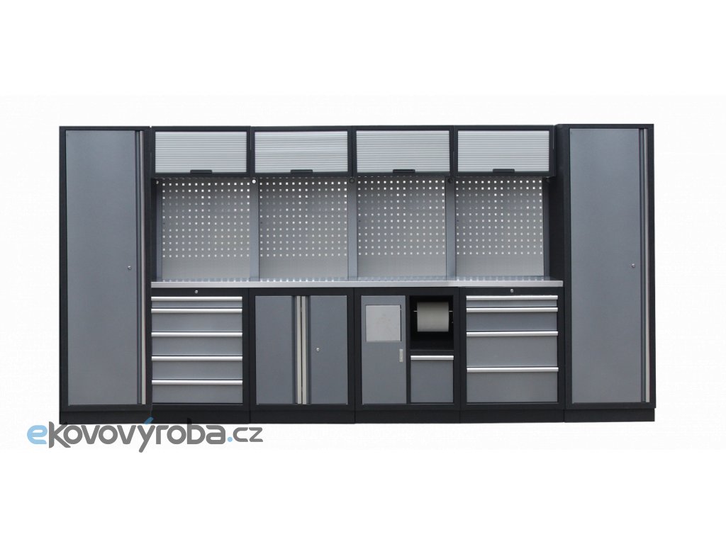 Dílenský nábytek PROFI GREY s nerezovou deskou zaujme moderním a profesionálním vzhledem. Kombinace kladívkové šedé a černé RAL 9004 barvy se bude vyjímat v každé garáži i dílně.