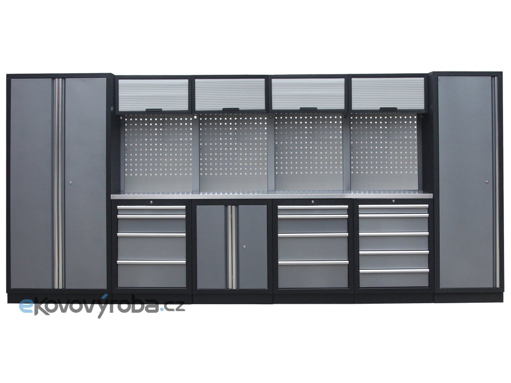 Dílenský nábytek PROFI GREY s nerezovou deskou zaujme moderním a profesionálním vzhledem. Kombinace kladívkové šedé a černé RAL 9004 barvy se bude vyjímat v každé garáži i dílně.