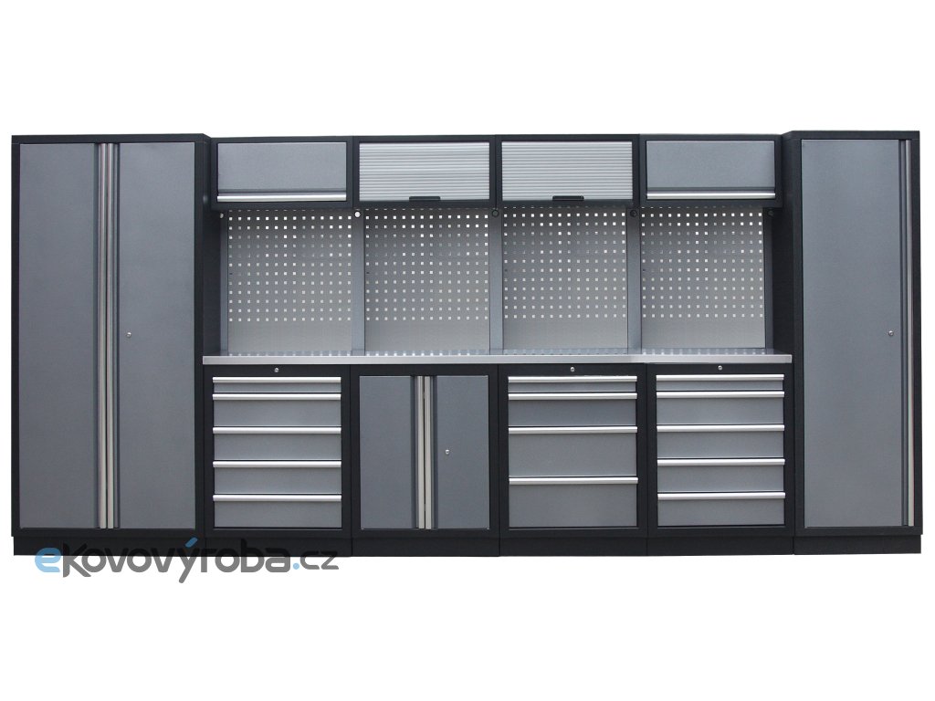 Dílenský nábytek PROFI GREY s nerezovou deskou zaujme moderním a profesionálním vzhledem. Kombinace kladívkové šedé a černé RAL 9004 barvy se bude vyjímat v každé garáži i dílně.